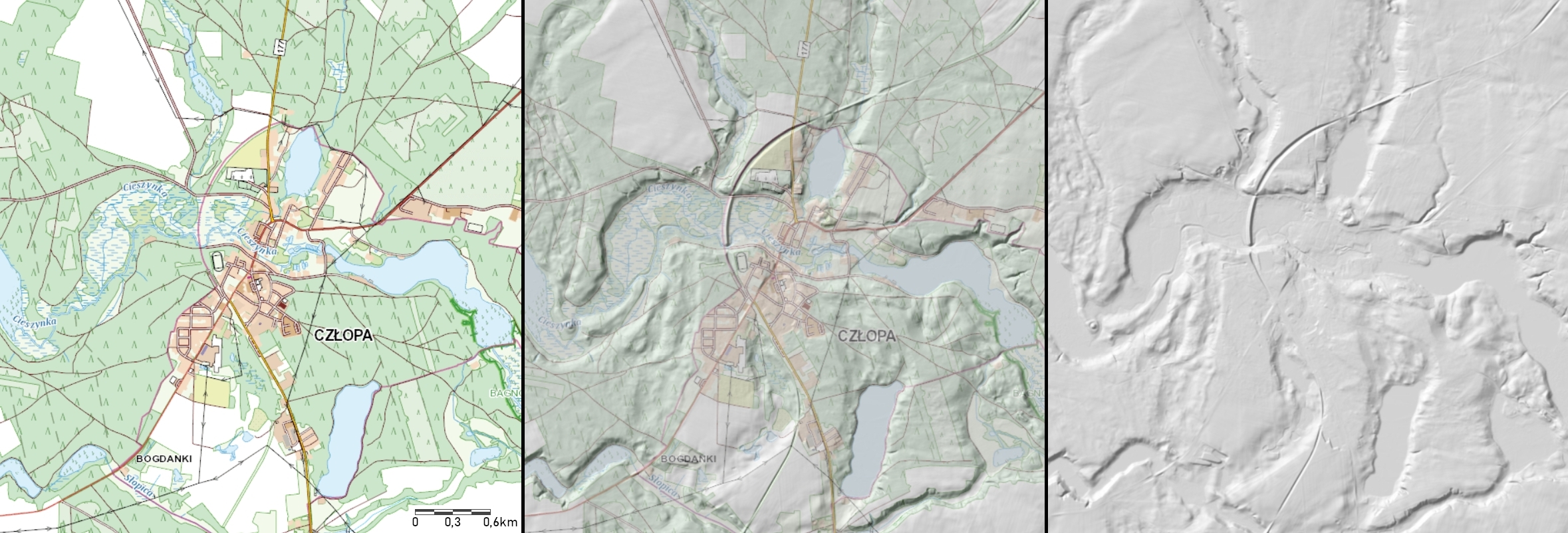 Zacznijmy od map archiwalnych. Zanim jednak cofniemy się o 250 lat, przedstawmy współczesną Człopę na mapie w skali 1:25000 z geoportal.gov.pl w trzech ujęciach: sporządzoną w oparciu o Bazę Danych Obiektów Topograficznych BDOT10k, „zmiksowaną” z podkładem – zobrazowaniem LIDAR i samo zobrazowanie LIDAR. Zobrazowanie LIDAR ma ułatwić uchwycenie różnic i podobieństw w ukształtowaniu powierzchni terenu. Właśnie taki zasięg będzie punktem wyjściowym dla dalszych przedstawień Człopy w ujęciach kartograficznych: