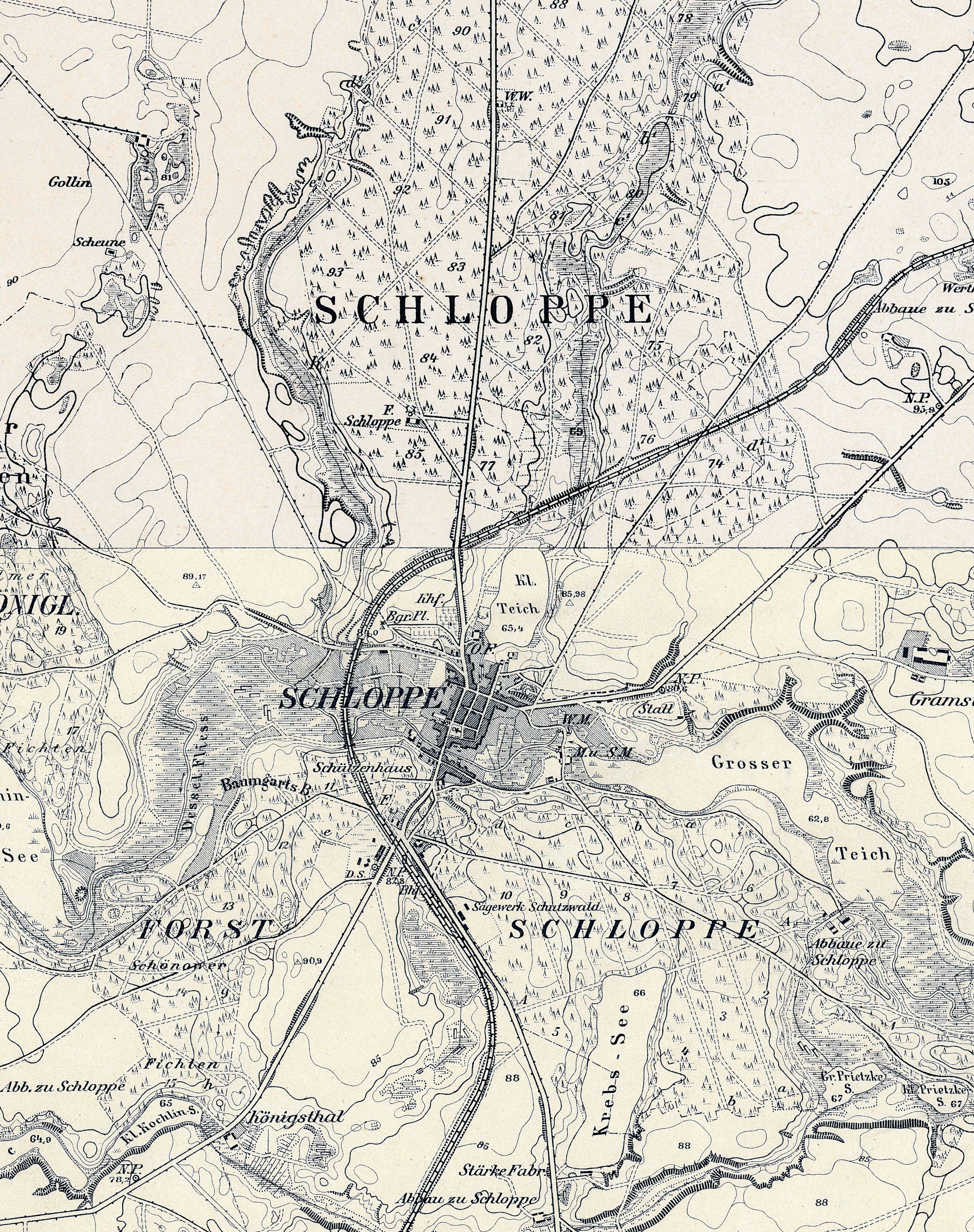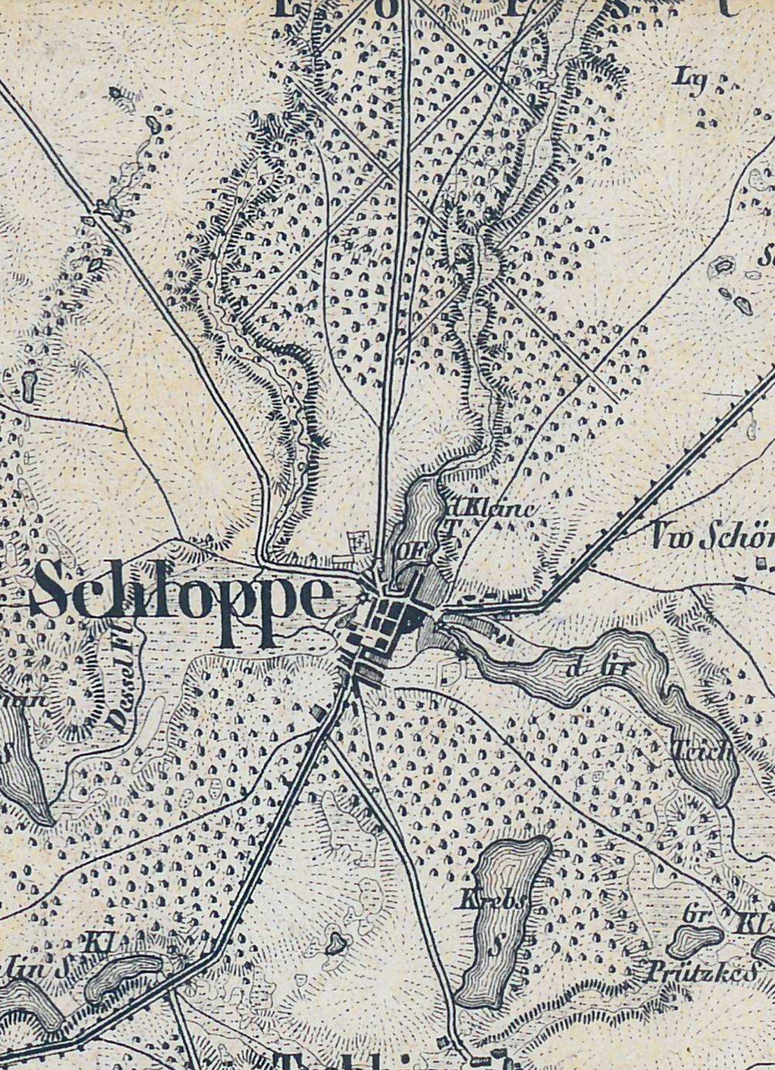 W porównaniu z mapą Schmettaua, widać o wiele większą dokładność i bogactwo szczegółów – sieć dróg i ich zróżnicowanie, szersze ukazanie pokrycia terenu i oznaczenie ważniejszych obiektów w mieście. Tym razem pola i łąki mieszkańców oznaczono bardzo podobnie jak zwartą zabudowę, co jest mylące w pierwszym momencie. Na terenie miasta oznaczono dwa młyny przy Jeziorze Młyńskim (gdzie wypływa Cieszynka) – „Walk, Mahl und Schn[eide] M[ühl]”, czyli folusz, młyn do mielenia mąki i tartaczny (któryś musiał mieć przynajmniej dwa koła) oraz kuźnię miedzi („Kupfer Ham[m]er”) na strumyku między jeziorem Miejskim a Cieszynką. Dodatkowo drewniany kościół katolicki, cmentarze, urząd leśny („Forst Amt Schloppe”) i „dobra rycerskie” („Rittergut”).