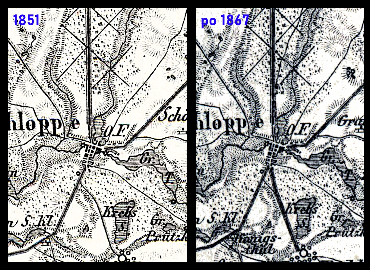 Dla Człopy znalazłem w sieci dwie mapy różniące się między sobą. Na pierwszej z nich – na której pojawia się dopisek z podaniem roku 1851 – droga prowadząca z Człopy do Trzebina jest oznaczona jako pośledniejsza niż ta do Dzwonowa i dalej do Dobiegniewa. Natomiast na drugim arkuszu obie te drogi są już oznaczone jako tej samej kategorii. Podobno w roku 1867 otwarto zmodernizowaną szosę Wieleń-Człopa-Tuczno (Złocieniec), co znaczyłoby, że niedatowany arkusz pochodzi z okresu po tym właśnie roku. Zresztą zobaczcie sami:
