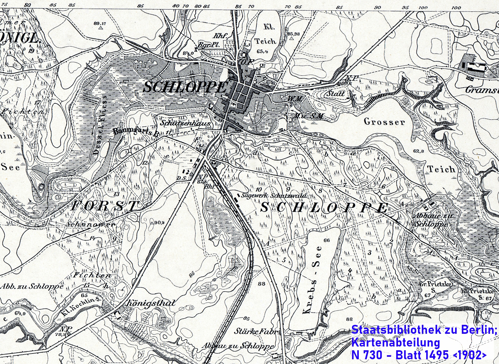 Pierwsze, co rzuca się w oczy na powyższej mapie, to przedłużenie linii kolejowej z Człopy do Wałcza (otwarcie pod koniec 1904 roku). Tor szerokim łukiem ominął miasto od zachodu, przecinając dolinę Cieszynki po specjalnie wzniesionym nasypie, w który wkomponowano most nad rzeką (przy czym jej koryto zostało na krótkim odcinku przesunięte bliżej południowej krawędzi doliny) i wiadukt nad drogą do Golina i Załomu. Dalsze dwa wiadukty znalazły się na skrzyżowaniach toru z szosą do Tuczna i drogą do dzisiejszej tak zwanej Rynny Grodzisko. W niektórych miejscach należało puścić tor w przekopach. Jeden z nich podzielił parcelę z domem strzeleckim; można przypuszczać, że pierwotny budynek został rozebrany, a na zachód od torów wzniesiono mniejszy. Przy dworcu widać zaznaczone co najmniej dwa tory kolejowe. Leśniczówka znana dziś jako Zwierz, wówczas była określana jako leśniczówka „Schloppe”.
