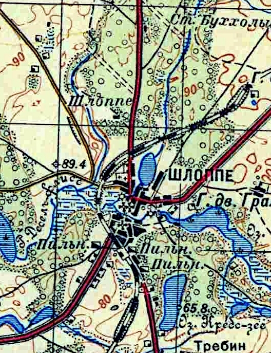 Większa skala i większa generalizacja. Pominięto pomniejsze drogi, część symboli i opisów, zaokrąglono wartości punktów wysokościowych. Co ciekawe, zamiast warstwic zastosowano kreskowanie na oznaczenie rzeźby terenu. Dom dróżnika szosowego przy drodze do Tuczna jest oznaczony jako leśniczówka (F.). Brak jednoznacznego oznaczenia kościoła katolickiego. Poza tym w zasadzie brak różnic w porównaniu z mapą z roku 1878.