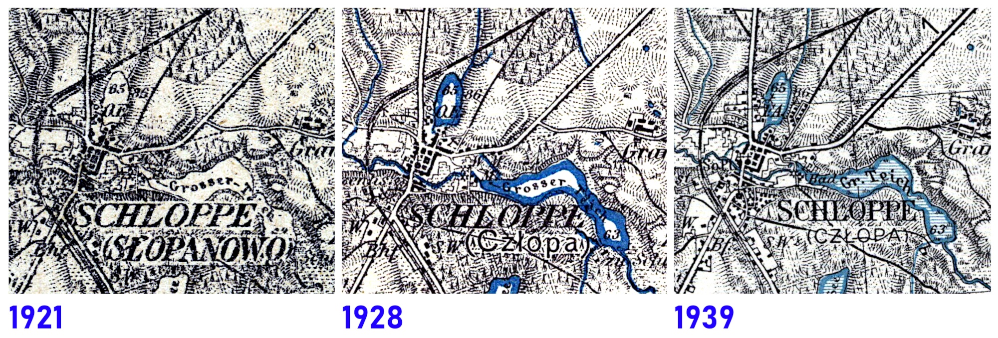 W przypadku map WIG, to Człopa leżała na tyle daleko od ówczesnej granicy polsko-niemieckiej, że nie znalazła się na indeksie map w skali 1:25000. Za to doczekała się własnego arkusza tak zwanej „setki”. W roku 1921 był on nazwany „221 Słopanowo. Schloppe”, a na wydaniach z lat 1928 i 1939 jako „221 Schloppe (Człopa)” – dodatkowym jego określeniem było jeszcze „Pas 36 Słup 22”. Polscy kartografowie nie tworzyli go od podstaw, a wykonali przedruk mapy niemieckiej (Karte des Deutschen Reiches), dodając polskie nazwy niektórych miejscowości, czasami kolor niebieski dla oznaczenia wód, a na marginesie umieszczając polską legendę i tłumaczenie niemieckich skrótów. Dlatego też ograniczmy się tylko do przeglądu fragmentu tych trzech wydań – chętni mogą porównać je z niemieckimi mapami powyżej.