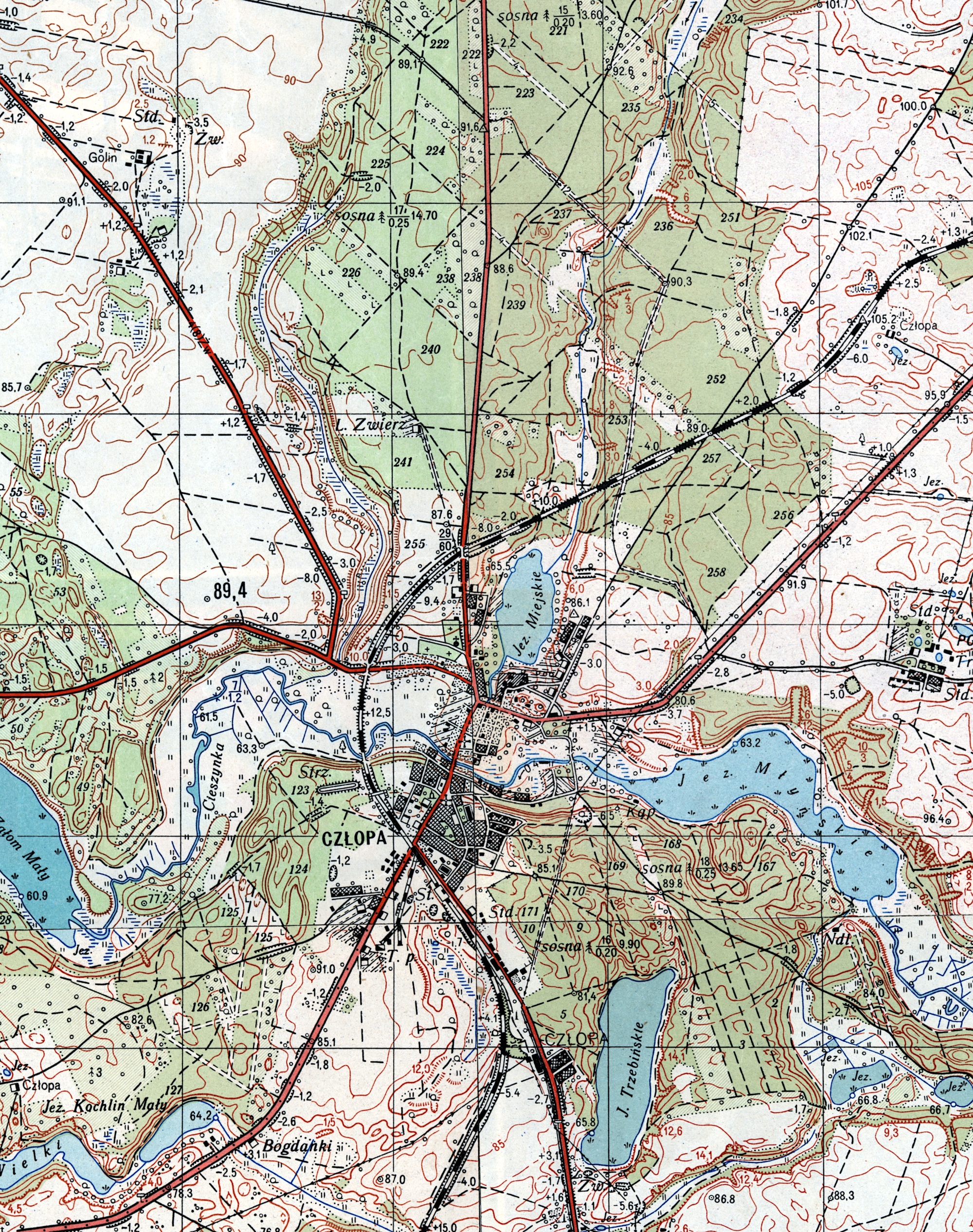 Rosjanie po drugiej wojnie światowej mieli dokładnie skartowany w zasadzie cały świat – dziś w ofercie sklepów internetowych bez trudu można znaleźć mapy topograficzne terenów największego wroga ZSRR – Stanów Zjednoczonych wydane przed 1990 rokiem. A co dopiero powiedzieć o Człopie, leżącej na terenie państwa, w którym Armia Radziecka miała swoje bazy. Poniższa mapa pochodzi z 1981 roku, nazwy własne podano przy użyciu alfabetu rosyjskiego jako zapis fonetyczny polskiego brzmienia (Człopa = Члопа, Cieszynka = Цешинка, Trzebin = Тшебин, Zwierz = Звеж).