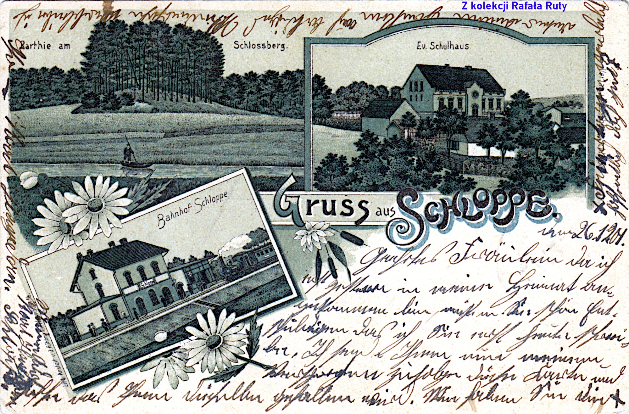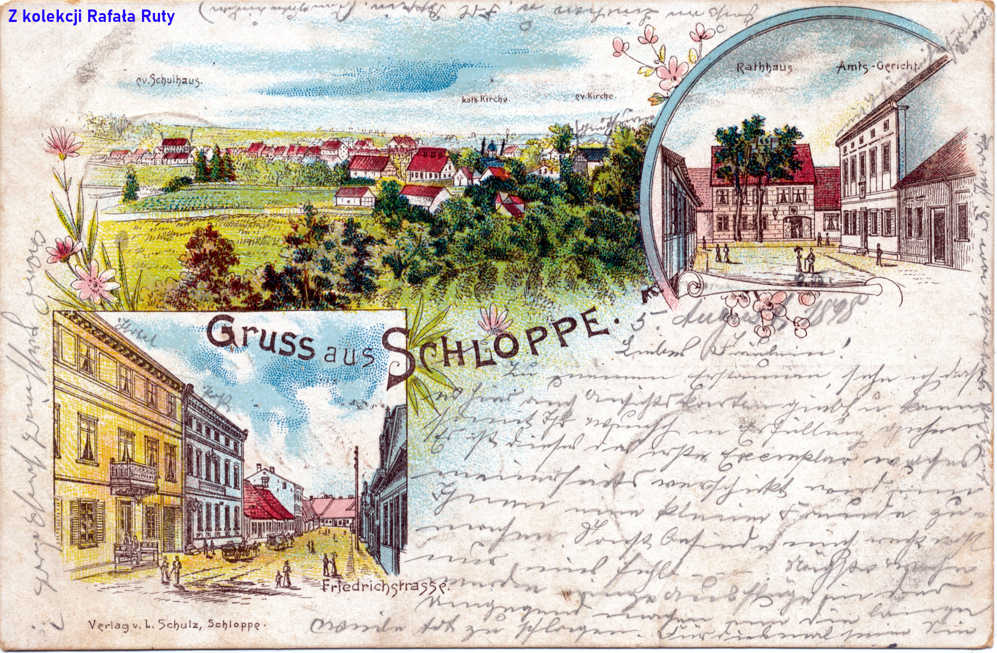 Na pierwszy ogień proponujemy bodaj najstarszą pocztówkę z widokami Człopy, jaka znajduje się w zbiorach Rafała Ruty. Ten konkretny egzemplarz został opatrzony datą 5 sierpnia 1898 roku. Świadczy to o tym, że co najmniej w tym roku była ona już dostępna w sprzedaży, a niewykluczone że już wcześniej. Wydana została w technice litografii przez człopskiego księgarza, introligatora i wydawcę Ludwiga Schulza, działającego w Człopie od 14 października 1891 roku (a dzięki któremu ukazało się później jeszcze wiele widokówek z Człopą w roli głównej; chyba jeszcze przed drugą wojną światową, a na pewno już w 1943 roku interes prowadziła Berta Schulz, wdowa po Ludwigu).