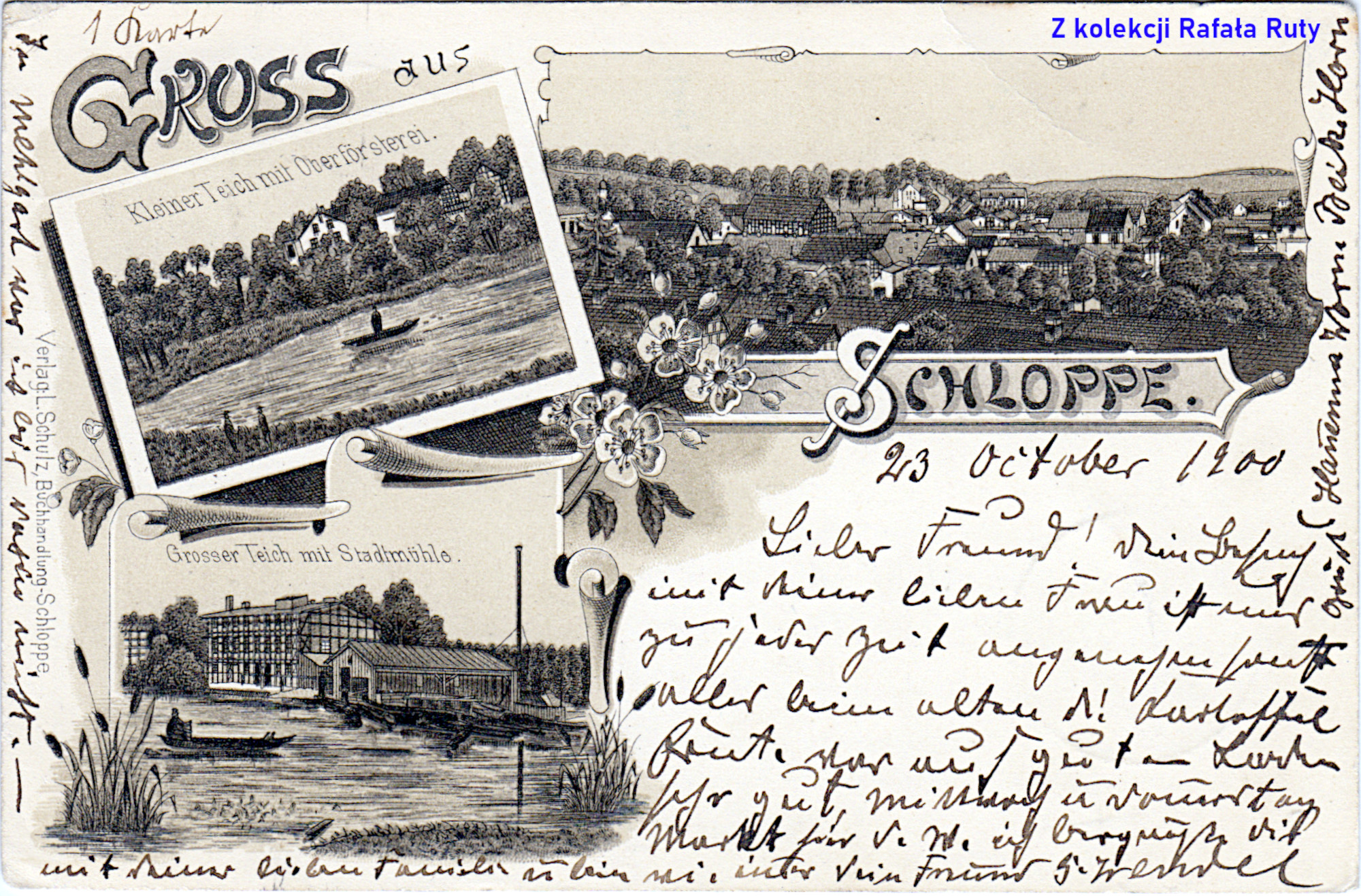 A teraz dwie pocztówki z tym samym przedstawieniem wykonanym w technice litografii, ale jedna kolorowa, a druga w szarościach. Kolorowa bez obiegu, a ta druga z obiegu, datowana na 23 października 1900 roku. Wydawcą ponownie był Ludwig Schulz. Wedle wzmianki w DKuSHB (numer kwietniowy z 1954 roku, strona 7), ta pocztówka miała przedstawiać Człopę około 1870 roku i wtedy już była dostępna w księgarni L. Schulza (i tak mamy kolejną zagadkę na temat początków tego człopskiego wydawcy).