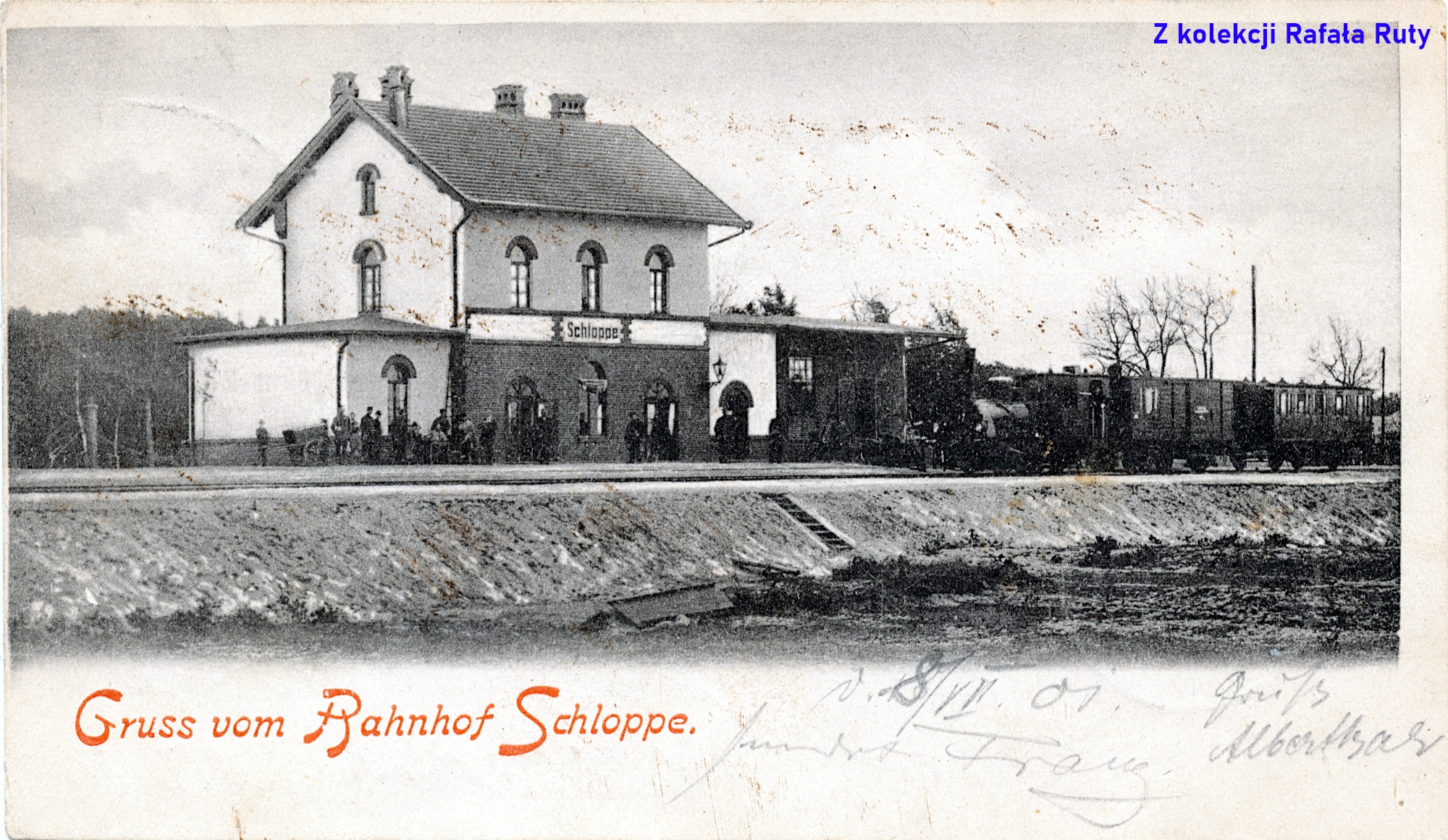 Starsza z pocztówek została nadana w 1901 roku. Jej format nieco odbiega od innych widokówek z tego okresu. Na awersie poza fotografią nadrukowano jedynie pozdrowienie z dworca w Człopie („Gruss vom Bahnhof Schloppe.”); nie znajdziemy na niej nazwiska wydawcy, ale w sieci można znaleźć kolorowaną wersję tego samego ujęcia, gdzie w podpisie widnieje Adolf Mottek z Piły (link; dostęp 19 marca 2024 roku).