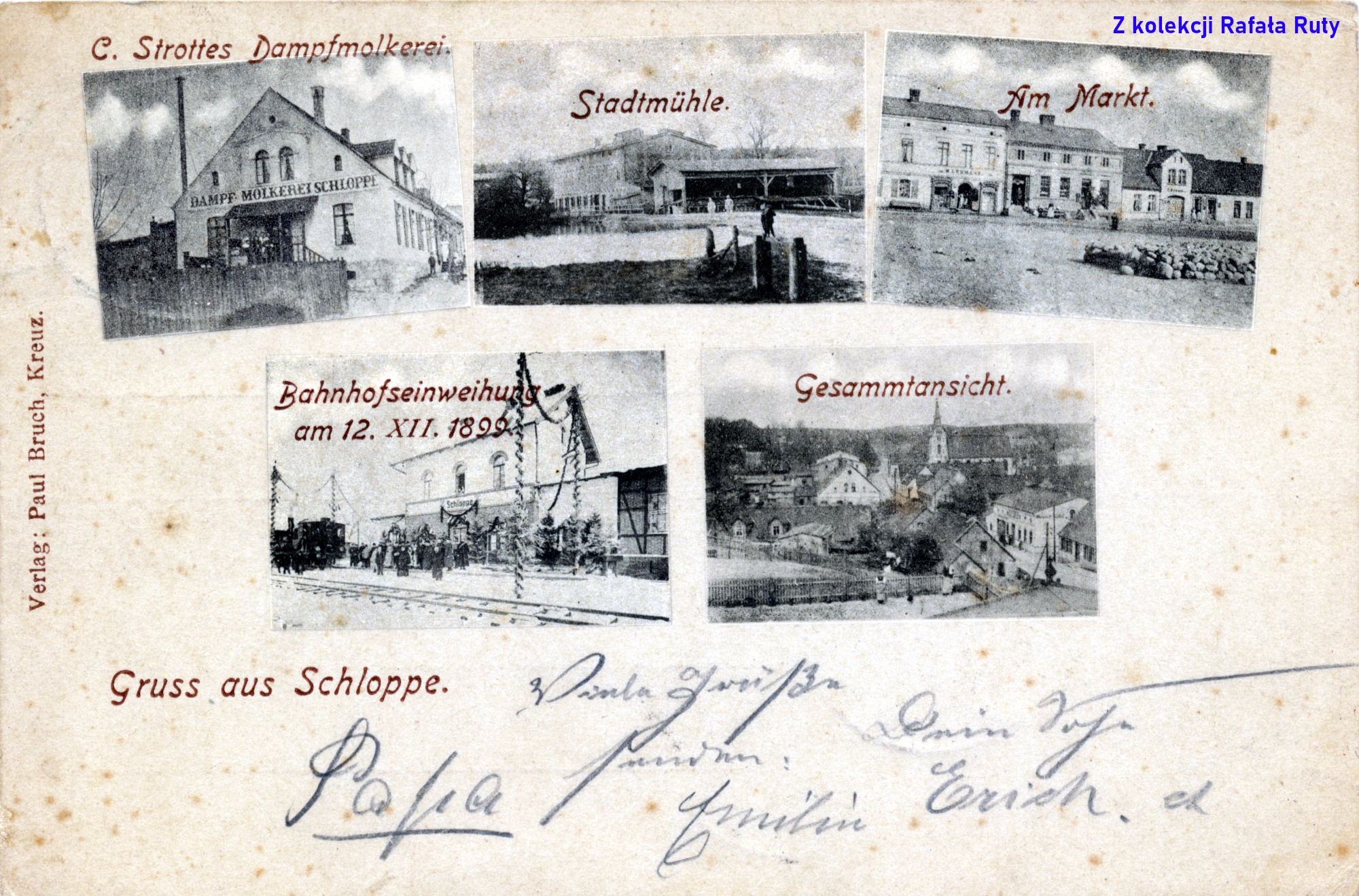 Przykład przełamania monopolu wydawniczego Ludwiga Schulza przez konkurencję z okolicy. Pocztówka z zestawionymi pięcioma niewielkimi czarno-białymi fotografiami z terenu Człopy, która została wydana przez Paula Brucha z Krzyża Wielkopolskiego po 1899 roku. Otrzymujący „Pozdrowienia z Człopy” mógł obejrzeć przy okazji dwa znaczniejsze miejscowe przedsiębiorstwa, kadr z uroczystego oddania do użytku linii kolejowej Człopa-Krzyż i dwa widoki – ogólny i szczegółowy – miasta.