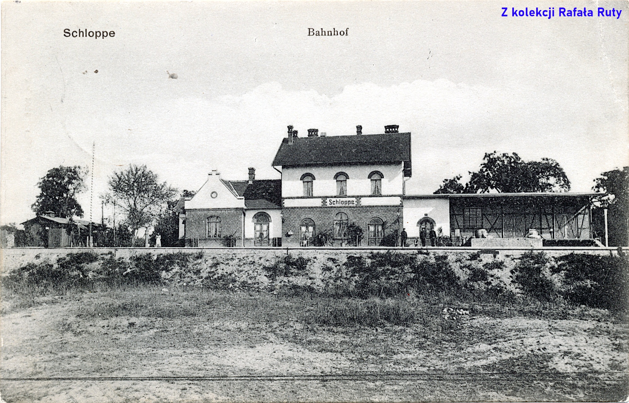 Ujęcie zamieszczone na drugiej z pocztówek (nadanej w 1909 roku) obejmuje nieco większy obszar stacji (i samej kartki). Jej wydawcą był Charles Lehmann z Berlina, który skorzystał z obowiązującej od 1905 roku możliwości wykorzystania w całości awersu kartki na reprodukowaną fotografię (treść korespondencji i adres wpisywało się na rewersie – podobnie jak dziś). Opis jest do bólu konkretny: „Schloppe” i „Bahnhof” („Człopa” i „Dworzec kolejowy”).