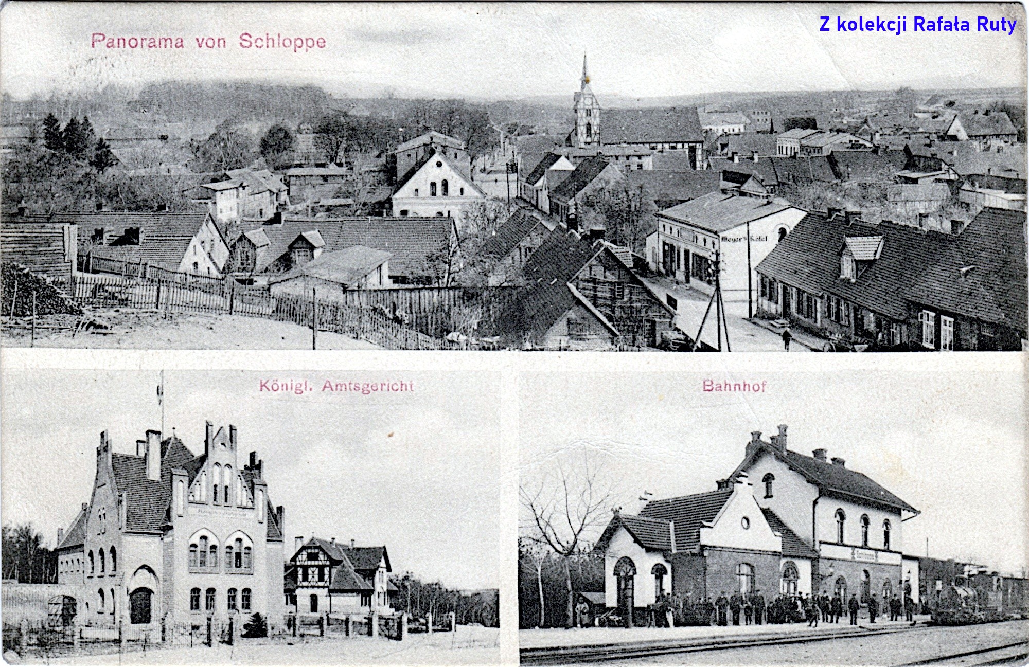 Ta mozaika trzech widoków pojawia się w tym miejscu ze względu na dwie poprzednie pocztówki – na niej również umieszczono fotografię człopskiego dworca kolejowego. Oprócz niego znalazła się „sprawdzona” panorama miasta oraz ujęcie reprezentacyjnych budynków: sądu i domu sędziego. Wydawca pocztówki jest nieznany, ale jeśli identyczna fotografia sądu była reprodukowana na pocztówce wydanej przez Reinholda Kelma z Berlina-Halensee (link; dostęp 19 marca 2024 roku), to może i jego wydawnictwo wypuściło poniższą widokówkę?