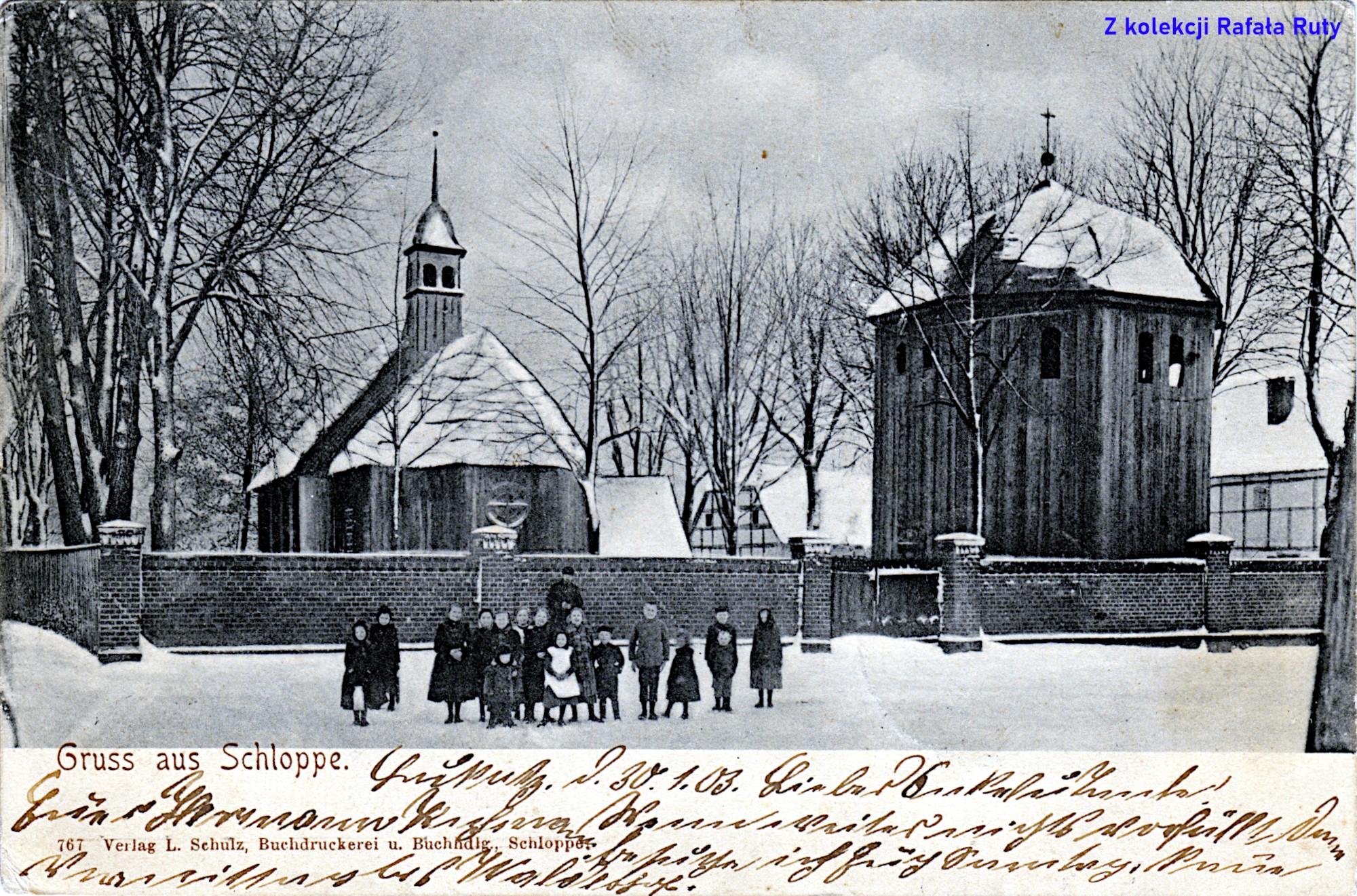 Jedyne mi znane tak rozległe przedstawienie kościoła i jego otoczenia. Zima i brak listowia sprawiły, że fotograf odważył się na taką aranżację. Pień drzewa z prawej strony pocztówki podpowiada, że aparat stanął gdzieś w okolicy wejścia do świątyni ewangelickiej (wtedy mogła być jeszcze bez wieży, ale już z drzewami zasadzonymi wokół niej). Na tle ceglanego muru z bramą wjazdową widoczna grupka dzieci. Czy mogli to być uczniowie i uczennice szkoły katolickiej? Ta mieściła się po lewej stronie kadru – prowadziła do niej Ścieżka Szkolna (Schulgasse) biegnąca wzdłuż widocznego płotu. Ten starszy mężczyzna za nimi mógłby być zatem ówczesnym duszpasterzem parafii lub pracującym tam nauczycielem lub kościelnym. Dzwonnica wydaje się być ogromną, mur też niczego sobie. Jednak należy pamiętać, że odnoszenie ich wysokości do wzrostu widocznego mężczyzny może być mylące, ówczesne pokolenia były znacznie niższe niż dziś. Między kościołem i dzwonnicą widoczny dom w konstrukcji pruskiego muru (ostatecznie szachulcowej) – to chyba plebania.