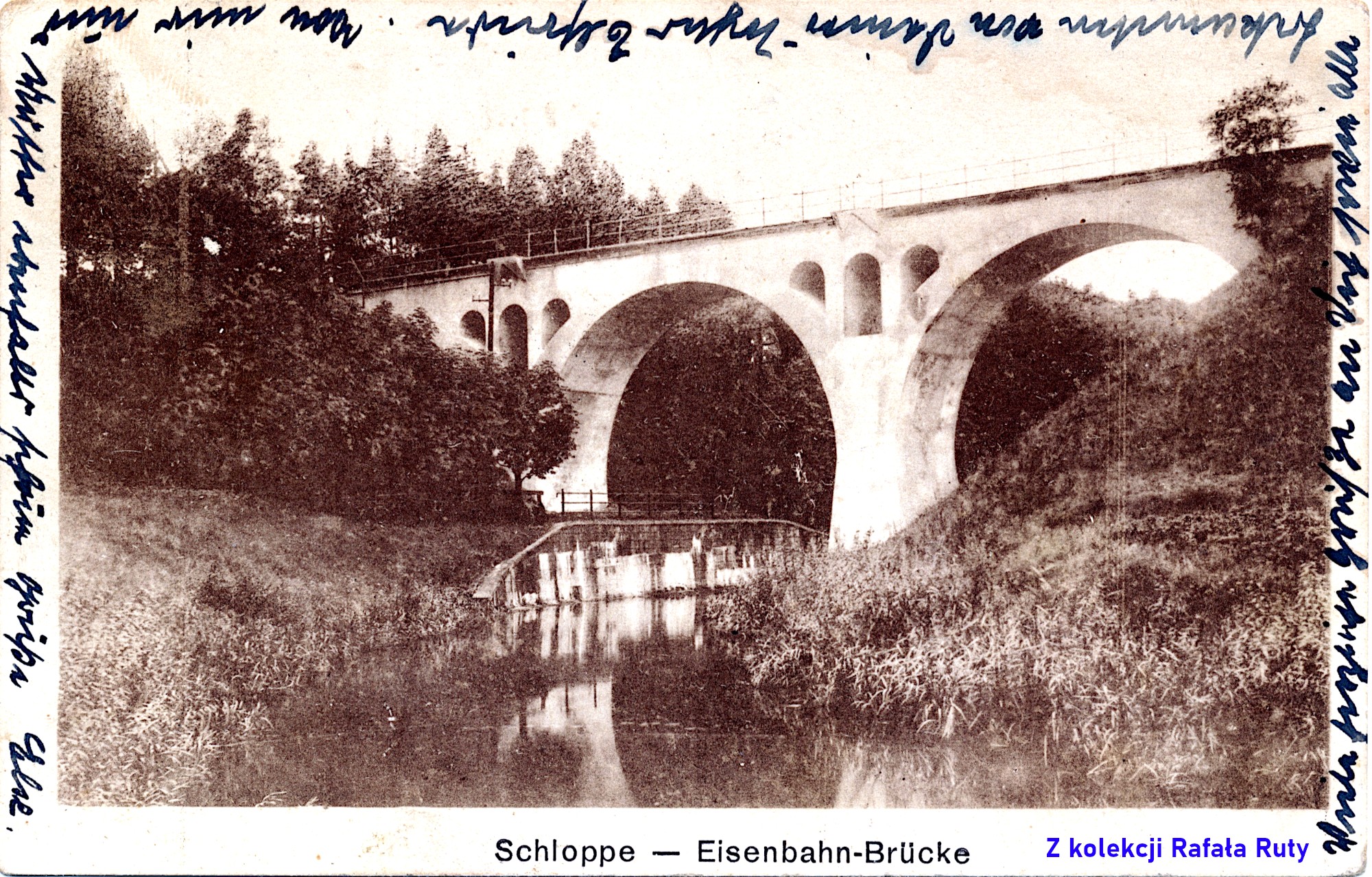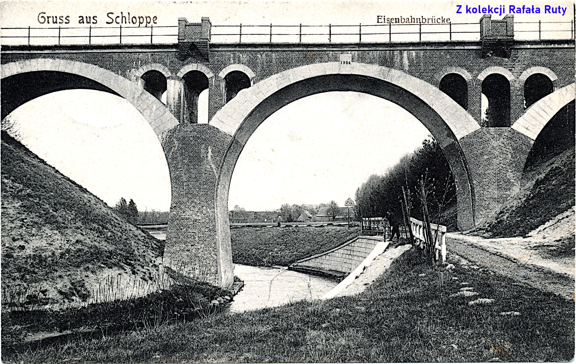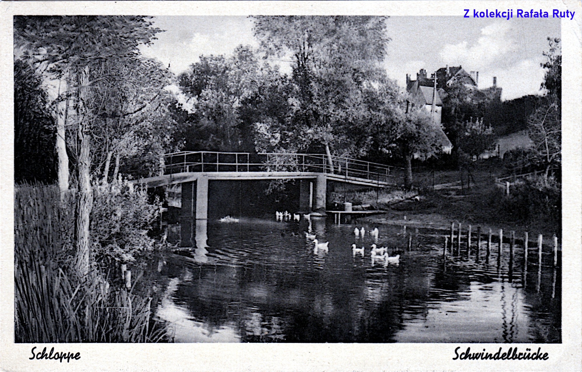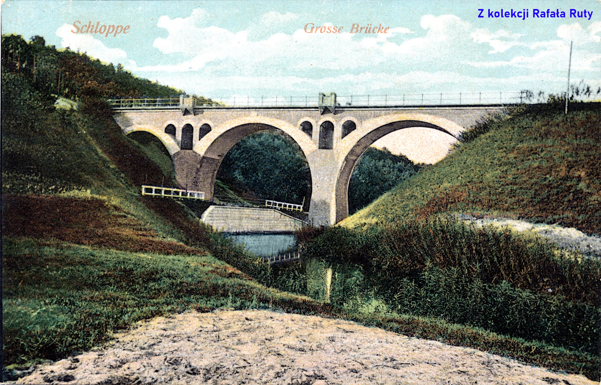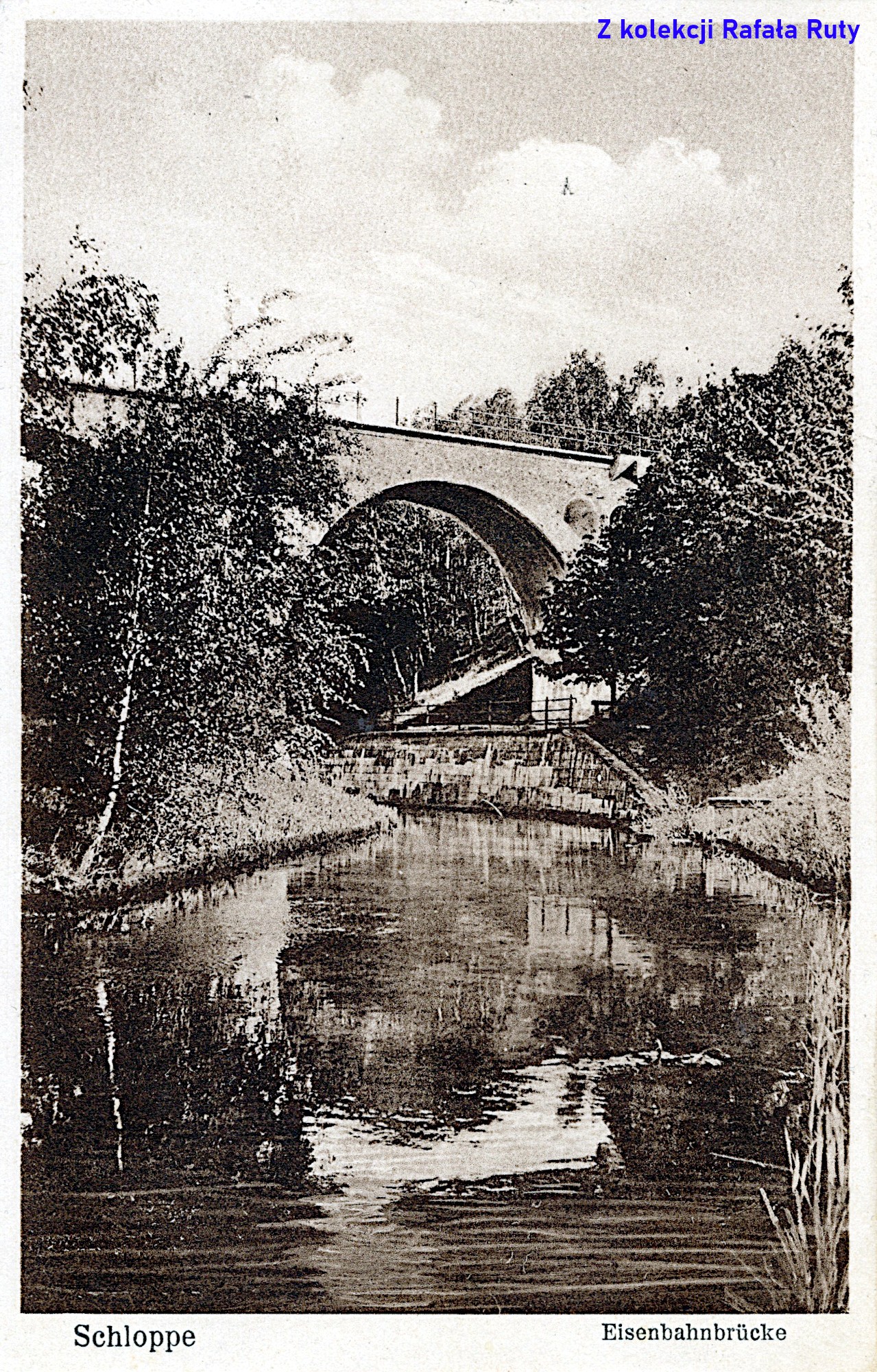 Pocztówka z podpisem „Schloppe” i „Schwindelbrücke”, przedstawia betonowy mostek (kładkę) nad Cieszynką, znajdujący się około 150 metrów na zachód od mostu na drodze krajowej numer 22. Na południowym brzegu rzeki widać zasłaniające się wzajemnie: ceglany transformator (na rogu dzisiejszych ulic Stefana Żeromskiego i Słonecznej), powyżej dom sędziego i budynek sądu obwodowego (przy ulicy Strzeleckiej).
