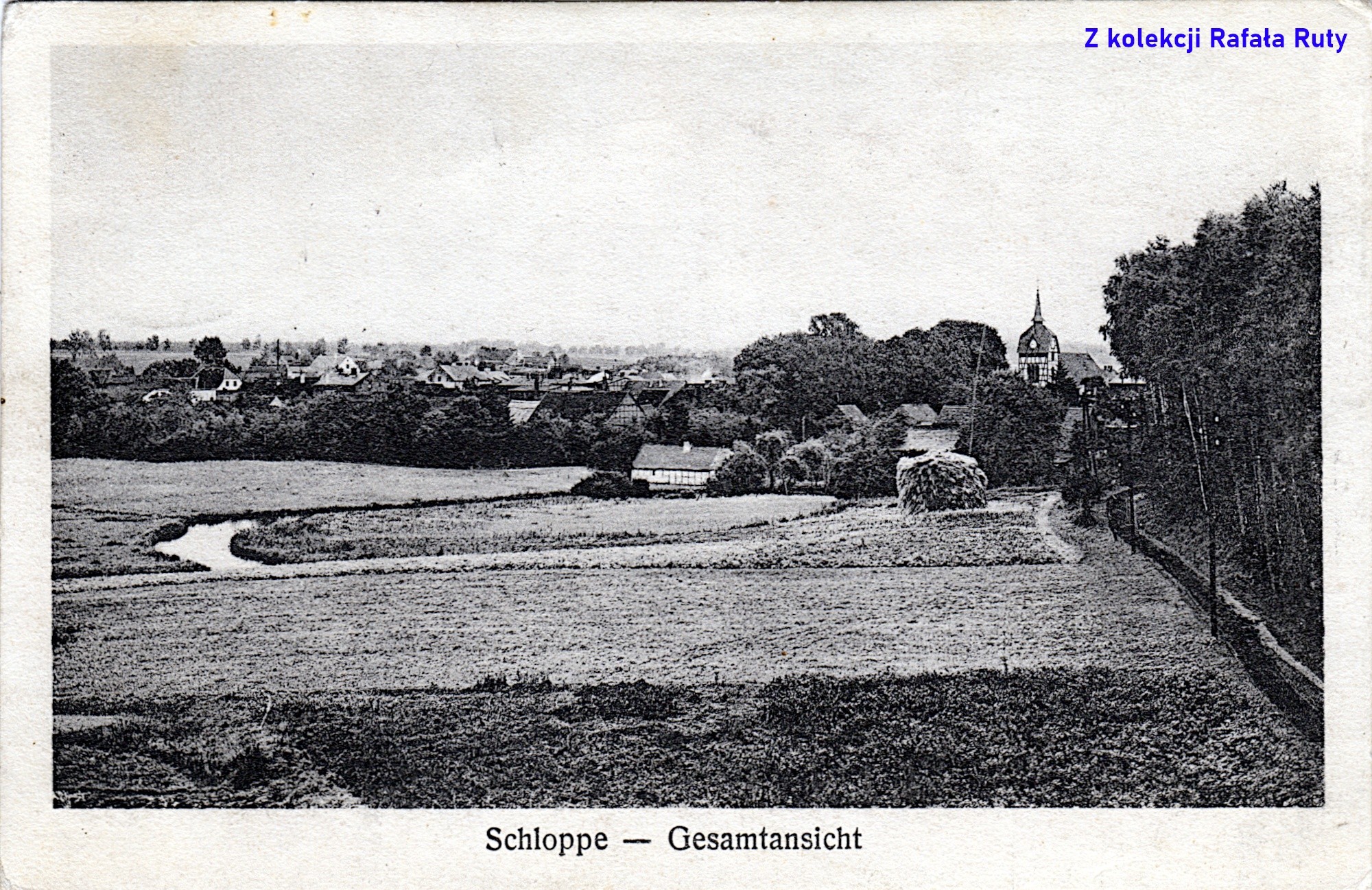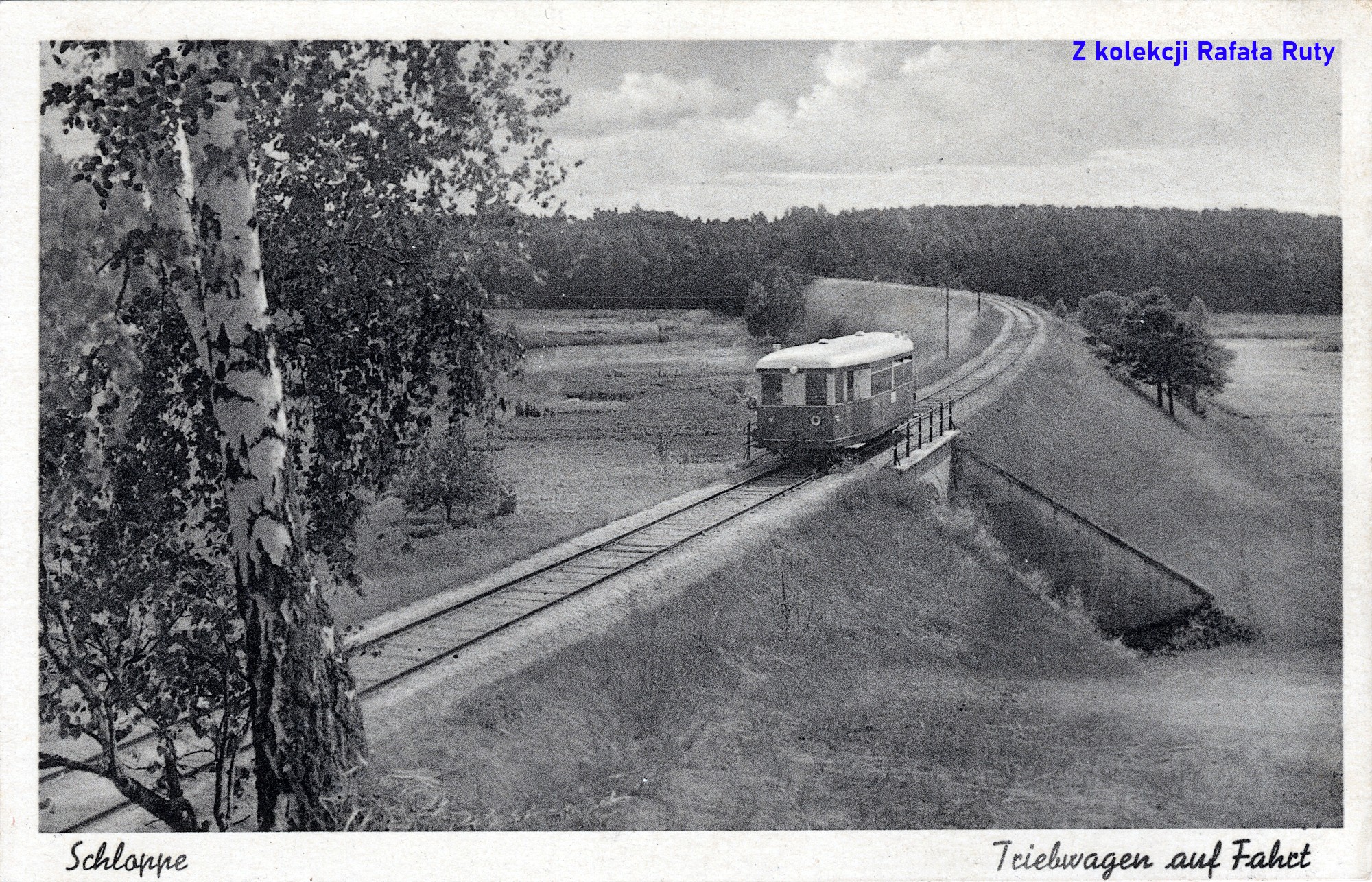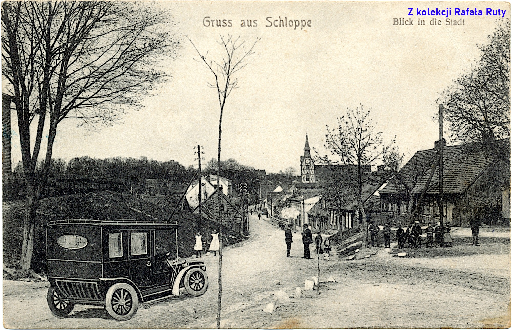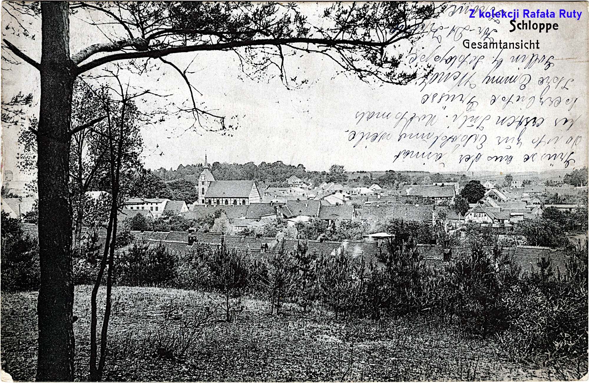 Mniej więcej taką właśnie Człopę oglądali pasażerowie tego pierwszego „szynobusu” – z budynkami schowanymi za gęstymi drzewami, że właściwie było widać tylko ich dachy. A przecież patrzyli na nią z okien pojazdu jadącego po wysokim nasypie – to świadczy o raczej niewielkiej wysokości ówczesnych domostw. Łąki w dolinie Cieszynki były intensywnie użytkowane – dostrzec można pokaźny stóg siana. Wzdłuż polnej drogi widać słupy telefoniczne. Na lewo od białej wieży kościoła ewangelickiego, wśród tych dorodnych drzew, stał drewniany kościół katolicki pod wezwaniem świętego Wojciecha. Ale znów nie jest nam dane zobaczyć go od zachodu, od tej mniej znanej strony. W chwili wykonania tego zdjęcia (data wydania tej pocztówki nie jest mi znana) nie było jeszcze domów przy dzisiejszej ulicy Polnej. Na horyzoncie widoczne drzewa rosnące wzdłuż szosy do Wałcza. Podpis głosi „Schloppe – Gesamtansicht”, czyli „Człopa – widok ogólny”.