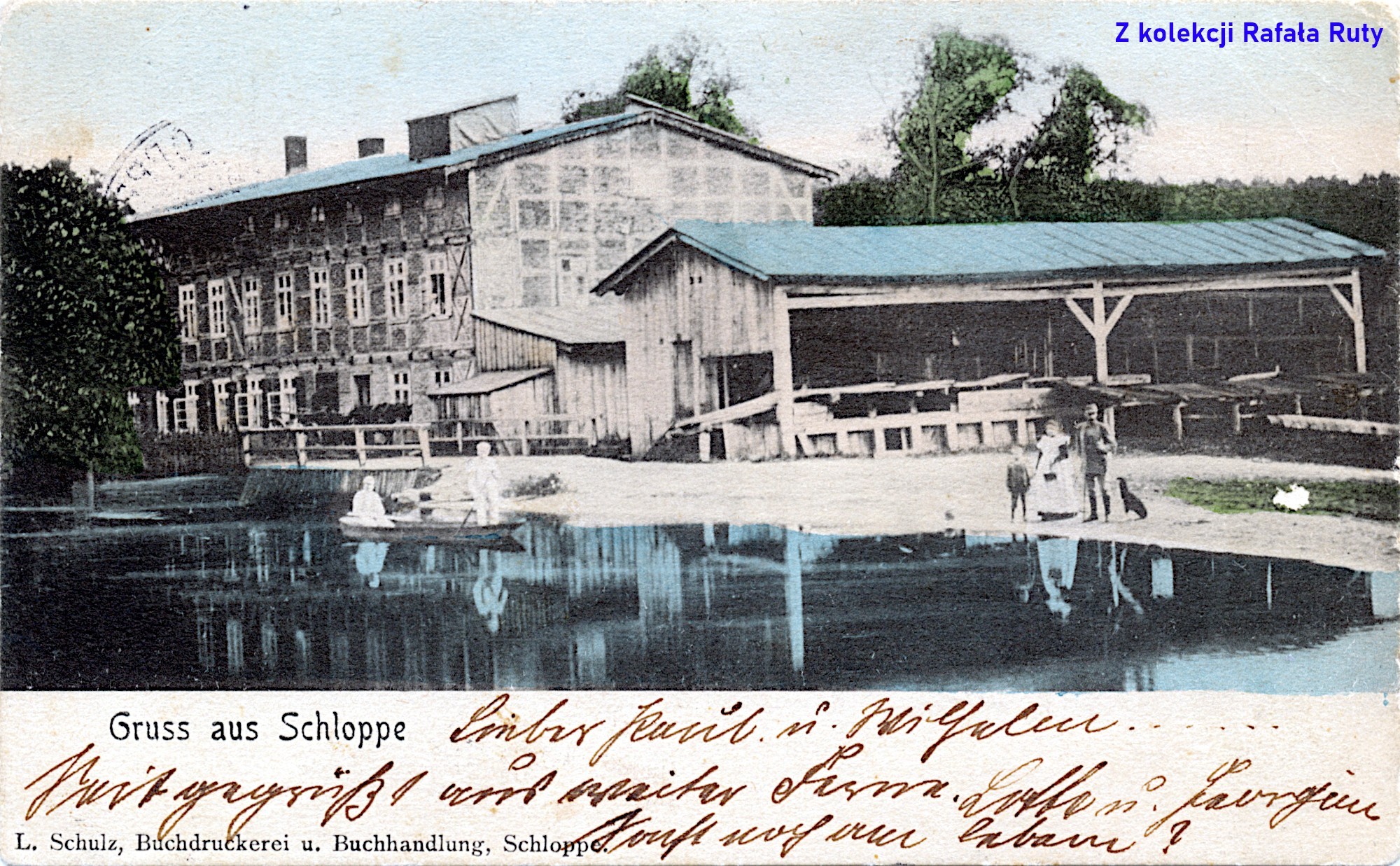 Jeszcze jedno ujęcie starego człopskiego młyna – tym razem od frontu (fotograf stał na dzisiejszej ulicy Młyńskiej, placami odwrócony w stronę jeziora). Wśród pozujących osób znajduje się właściciel młyna Paul Witt wraz z żoną i dwójką dzieci: Berthą i Otte (DKuSHB, nr 5/1981, strona 5 – kliknij, aby zobaczyć). Opis na pocztówce typowo informacyjny – „Stadtmühle Schloppe”, czyli „Młyn miejski Człopa”.
