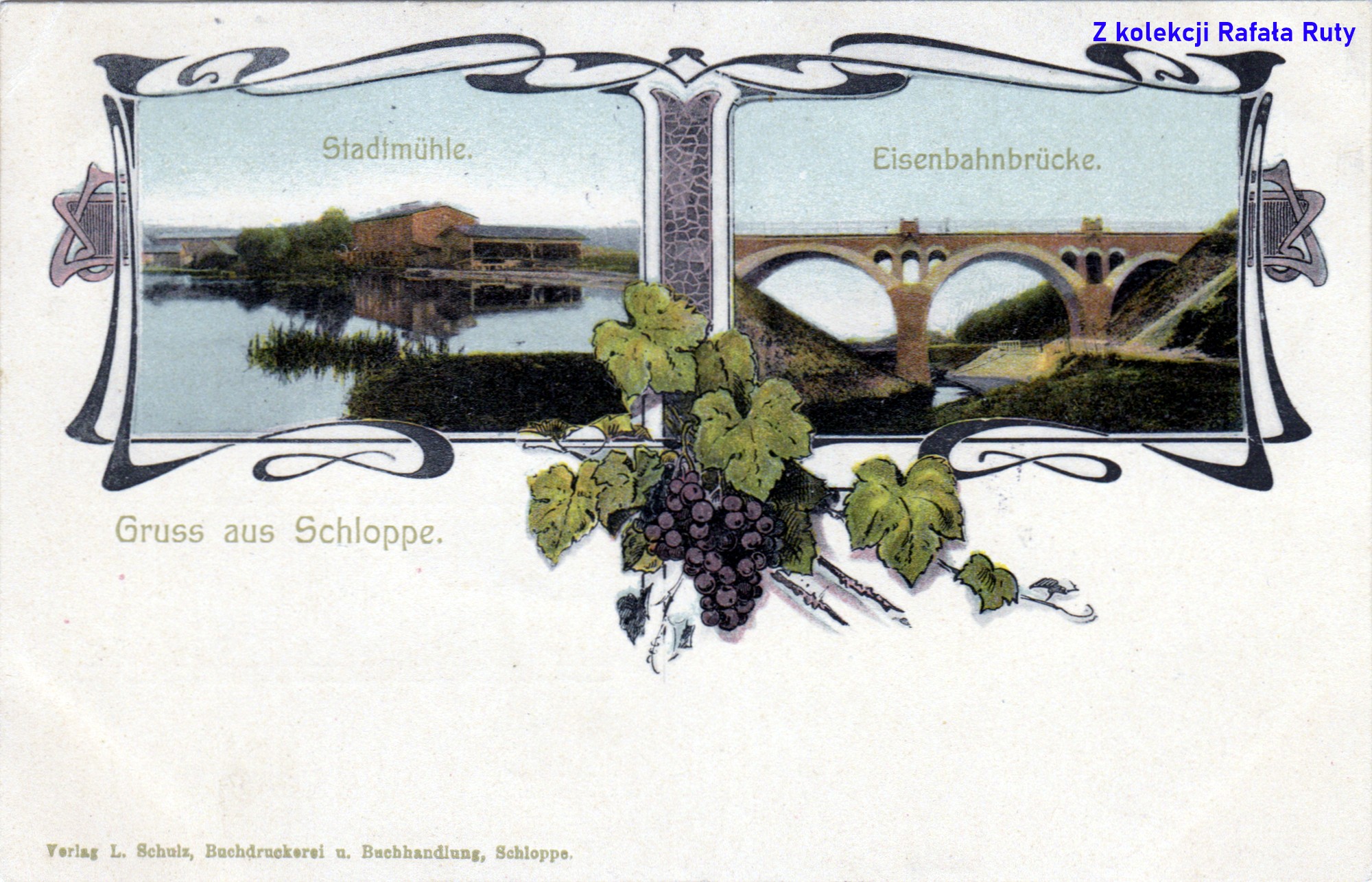 Kolejna pocztówka z wydawnictwa Ludwiga Schulza z pozdrowieniami z Człopy („Gruss aus Schloppe”). Widzimy na niej w secesyjnym ornamencie dwie kolorowane fotografie. Ta z lewej przedstawia młyn miejski („Stadtmühle”) nad Jeziorem Młyńskim, w miejscu gdzie uchodzi z niego Cieszynka. Obok budynku młyna z pruskiego muru, stoi wiata na deski i belki, być może mająca związek z działającym też w tym miejscu tartakiem o napędzie wodnym. Fotografia z prawej strony to ujęcie od zachodu mostu kolejowego nad Cieszynką („Eisenbahnbrücke”). Ilość miejsca pozostawionego na korespondencję, sugeruje powstanie wzoru tej karty pocztowej jeszcze przed „uwolnieniem” strony adresowej w 1905 roku (zobacz opis pocztówki numer 5).