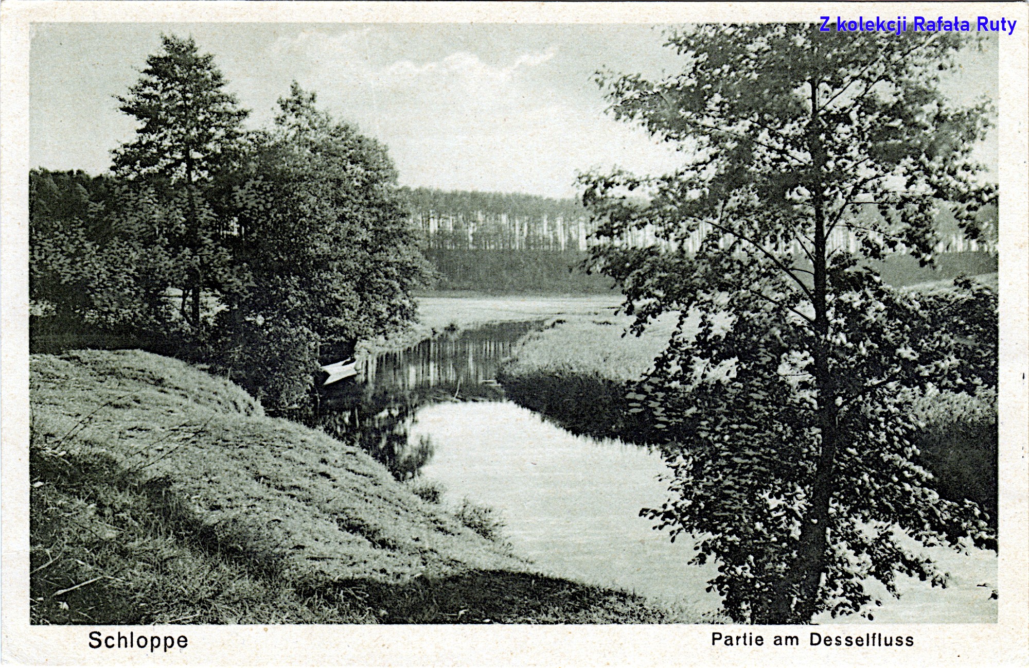 Jeszcze jedno ujęcie Cieszynki w okolicy Człopy, uwiecznione w nieznanej mi lokalizacji. Czcionka w podpisie (takim samym jak na poprzedniej pocztówce) wykazuje podobieństwo do widokówek wydawanych w latach 1920. Zacumowana przy brzegu drewniana łódź to dziś widok niemal niespotykany.