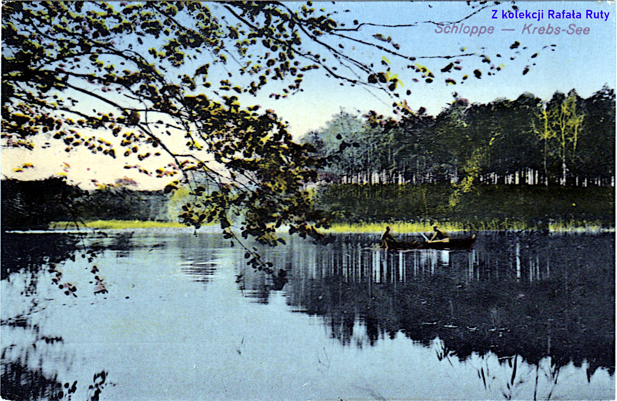 W przypadku tej pocztówki ośmielę się wysunąć przypuszczenie, że oglądamy na niej północny brzeg Jeziora Trzebińskiego („Partie am Krebs-See” – „Widok na Jezioro Trzebińskie [Rakowe]”). Ściana lasu po prawej stronie wygląda jakby załamywała się w miejscu istniejącej tam zatoki (a może to tylko gra kolorów użytych do pokolorowania czarno-białej fotografii…).