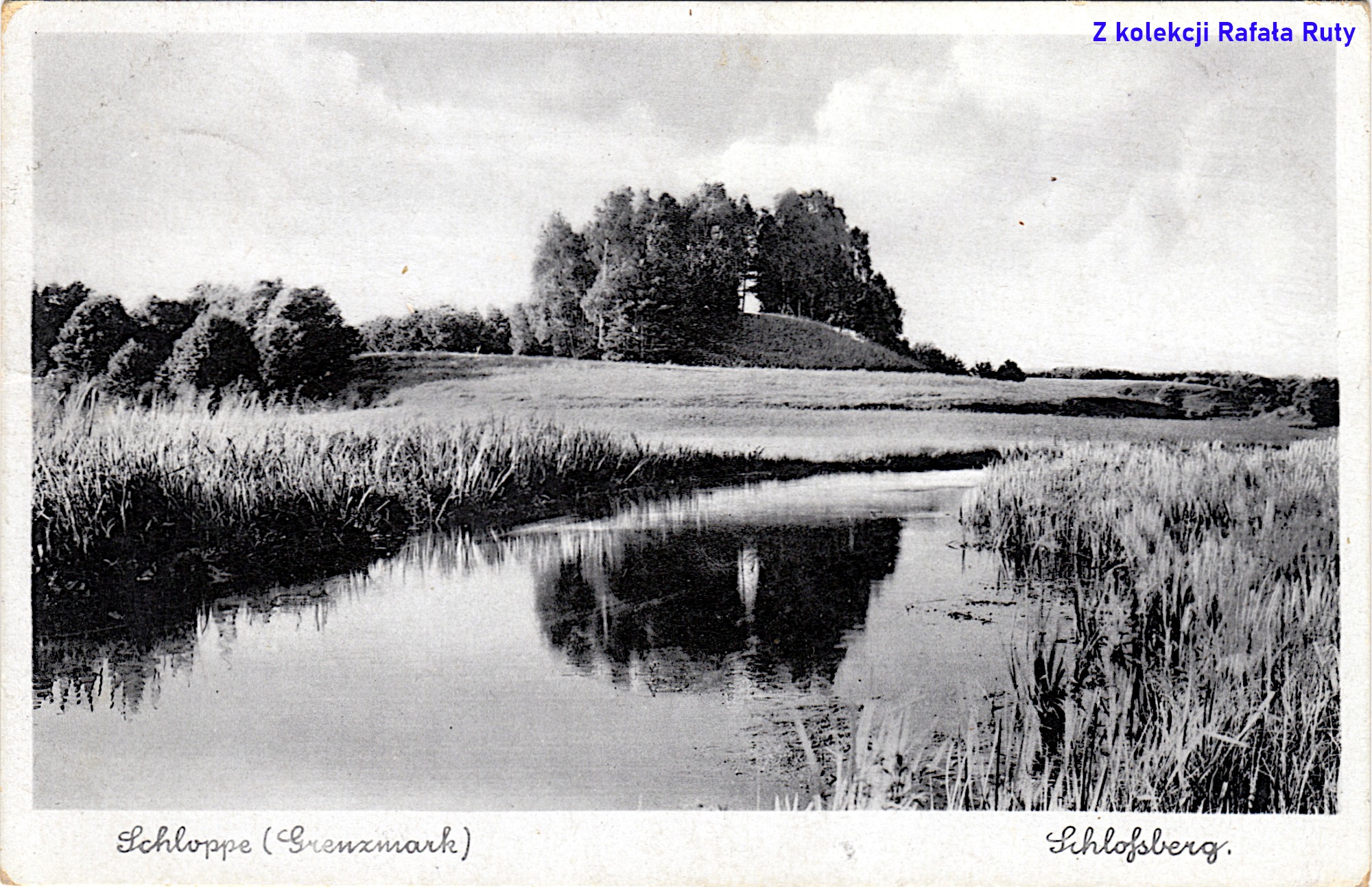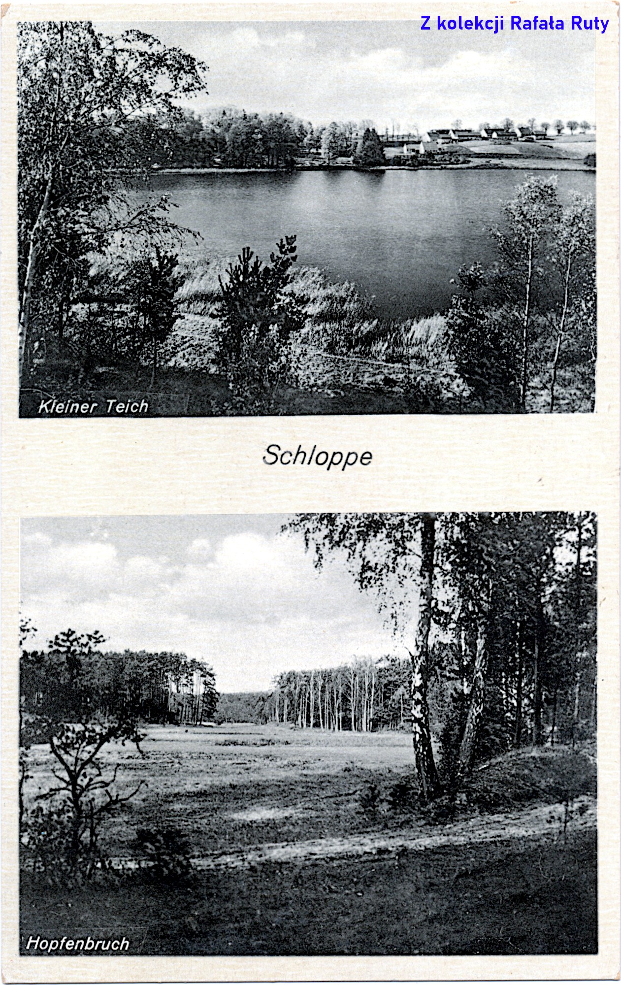Z tymi nazwami jezior to w ogóle jest kłopot – nasze „Trzebińskie”, lub po prostu „Trzebin”, było do 1945 roku nazywane „Krebs-See”, dlatego i dziś zwie się je gdzieniegdzie Rakowcem. Podobnie rzecz ma się z „Młyńskim” – do 1945 nosiło nazwę „Grosser Teich” – „Wielki Staw”, a po wojnie zostało „Młyńskim Stawem”, od znajdującego się nad nim młyna. Natomiast widoczny na pocztówce podpis „Partie am großen Teich” w ogóle sugeruje, że to cześć widoku nad jakimś dużym stawem, ponieważ przymiotnik „großen” zapisano małą literą, więc jakby nie był częścią nazwy własnej. U dołu pocztówki, zdecydowanie akcentującej przyrodnicze walory miasta i okolic, większymi literami zapisano „Schloppe / Grenzm[ark]” („Człopa / Marchia Graniczna”).