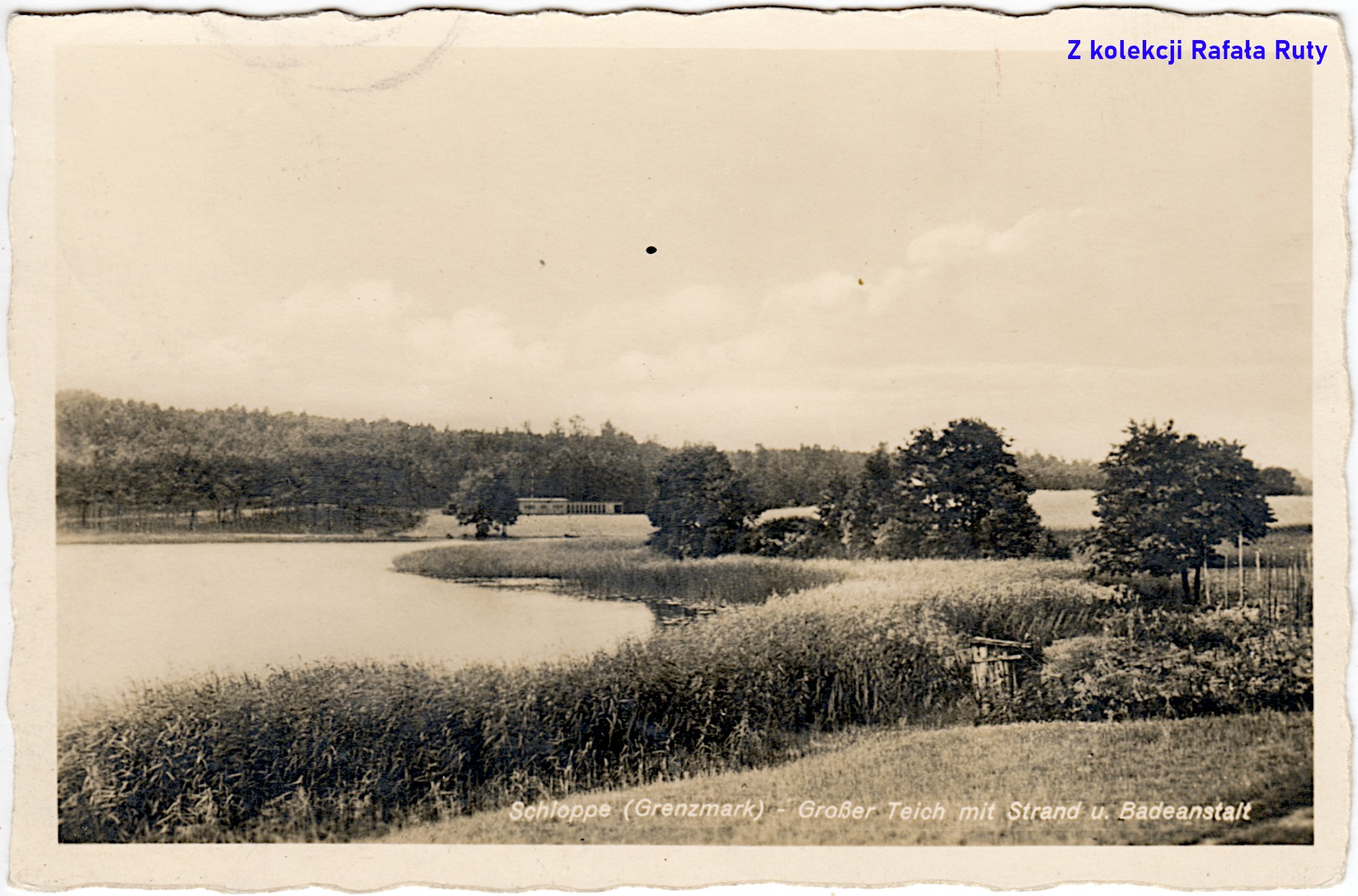 Podpis na zdjęciu tym razem jest bogaty w szczegóły: „Schloppe (Grenzmark) – Großer Teich mit Strand u[nd] Badeanstalt”, w tłumaczeniu „Człopa (Marchia Graniczna) – Wielki Staw z plażą i zakładem kąpielowym” (również i tu zastosowano rozwiązanie z nadrukiem na przezroczystej kliszy).