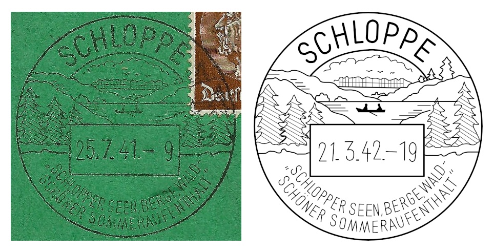 Tym razem zrezygnowano z panoramy miasta i ukazano trzy pojedyncze obiekty: dzisiejsze grodzisko przy ujściu Cieszynki do jeziora Kamień (Parthie am Schlossberg, w przybliżeniu można to przetłumaczyć „Widok na Górę Zamkową”); budynek szkoły ewangelickiej (Ev[angelische] Schulhaus), czyli „czerwona kamienica” przy dzisiejszej ulicy Adama Mickiewicza 19 widziana z terenu cmentarza oraz człopski dworzec kolejowy (Bahnhof Schloppe) widziany od południowego zachodu. Dwie ostatnie litografie bardzo przypominają fotografie wykorzystane na innych pocztówkach z tamtego okresu.