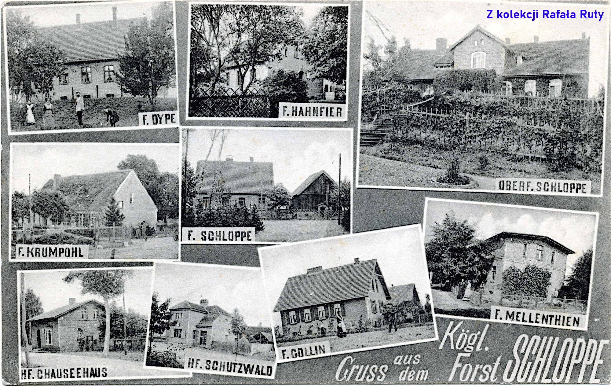 Obok zdjęcia siedziby nadleśnictwa („Oberf[örsterei] Schloppe” – tu widzianej od południowej strony, od ogrodu), znalazło się osiem fotografii leśniczówek i leśniczówek pomocniczych (dla podleśniczych) – odpowiednio „Försterei” (F.) i „Hilfsförsterei” (HF.):