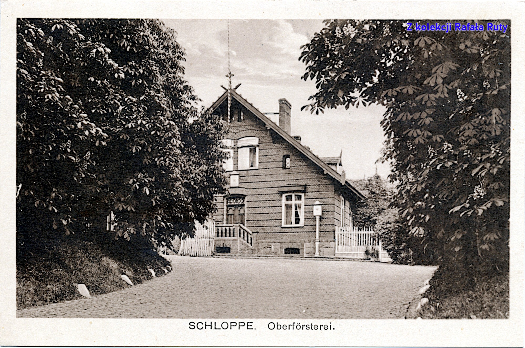 Siedziba człopskiego nadleśnictwa (czyli „Oberförsterei” z podpisu) przed 1945 rokiem wielokrotnie trafiała na awersy pocztówek. Znane są jej ujęcia od frontu, od strony ogrodu oraz od zachodniego szczytu, jak to powyżej (na marginesie – ta fotografia została wykorzystana przynajmniej na dwóch innych wzorach widokówek). Obecna elewacja – będąca efektem remontu z początku lat dwutysięcznych – odróżnia się od tej ze zdjęcia. Tu wyraźnie widać kamienną podmurówkę i czerwoną cegłę na całej wysokości budynku. Boczne schodki funkcjonowały jeszcze po drugiej wojnie światowej. Niewykluczone, iż stanowiły przez lata „urzędowe” wejście do budynku, skoro wjazd na podwórze zamykała widoczna po lewej stronie brama, a nad drzwiami i na narożniku budynku widać dwa podobne „szyldy” (z pruskim orłem? ten zamocowany na słupie mógł być podświetlany). Dodatkowo właśnie nad tym wejściem umocowano do zwieńczenia dachu pomalowany na dwukolorowo drzewiec – czy miał on służyć za coś w rodzaju masztu flagowego, czy też miał inne zastosowanie, tego nie wiem. Po obu stronach brukowanego podjazdu widoczne dwa dorodne kasztanowce.