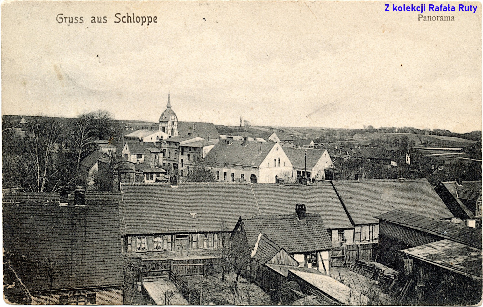 Położenie najstarszej części Człopy w dość głębokiej dolinie Cieszynki przez lata warunkowało uwiecznianie jej widoku ogólnego na zdjęciach (litografiach) z dwóch miejsc – z północnej lub południowej krawędzi doliny. Nawet pojawienie się nasypu kolejowego za bardzo tego nie zmieniło, bo był oddalony od zabudowań, które i tak od tamtej strony chowały się wśród drzew. W początkach XX wieku fotografujący najczęściej wybierali południowy stok (słońce w plecy? nieco luźniejsza zabudowa? ujęcie aż tak niezasłonięte drzewami?), przez co taki widok miasta wydaje się nieco opatrzony. Tak jest i w tym przypadku. Opis „Panorama von Schloppe” można przetłumaczyć jako „Panorama Człopy”. Ujęcie bardzo podobne do tego z pocztówki z 1902 roku (punkt czwarty tego wpisu). Panorama doczekała się swojej kolorowanej edycji (link; dostęp 28 marca 2025 roku).