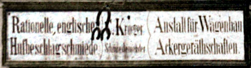 Z tabliczki nad oknami z prawej strony dowiadujemy się, że sprzedawał kosiarki firmy McCormick („McCORMICK Mähmaschinen”). Szyld nad bramą wjazdową na podwórze – ozdobiony kompozycją z trzech podków – informował: „Rationelle, englische Hufbeschlagschmiede | C. Krüger Schmiedemeister | Anstalt für Wagenbau; Ackergeräthschaften”, co możemy przetłumaczyć jako: „Racjonalne, angielskie podkuwanie | C. Krüger mistrz kowalski | Zakład budowy wozów; narzędzia rolnicze”. To „angielskie podkuwanie” oznaczało praktykowanie zasad wprowadzonych na grunt niemiecki w drugiej połowie dziewiętnastego wieku, opartych o system ogłoszony przez Anglika Williama Milesa. Zwróćmy uwagę, że tym razem na awersie pocztówki (na rewersie zresztą też) nie naniesiono żadnych napisów informujących o obiekcie z fotografii (nawet nazwy miasta) – to cecha charakterystyczna dla tego rodzaju kart pocztowych. Była to bardziej forma pamiątki i „pokazania się” rodzinie lub znajomym. Przemawia za tym fakt, że akurat ta kartka została wysłana przez Krügerów do obchodzącej swoje urodziny krewnej z Berlina.