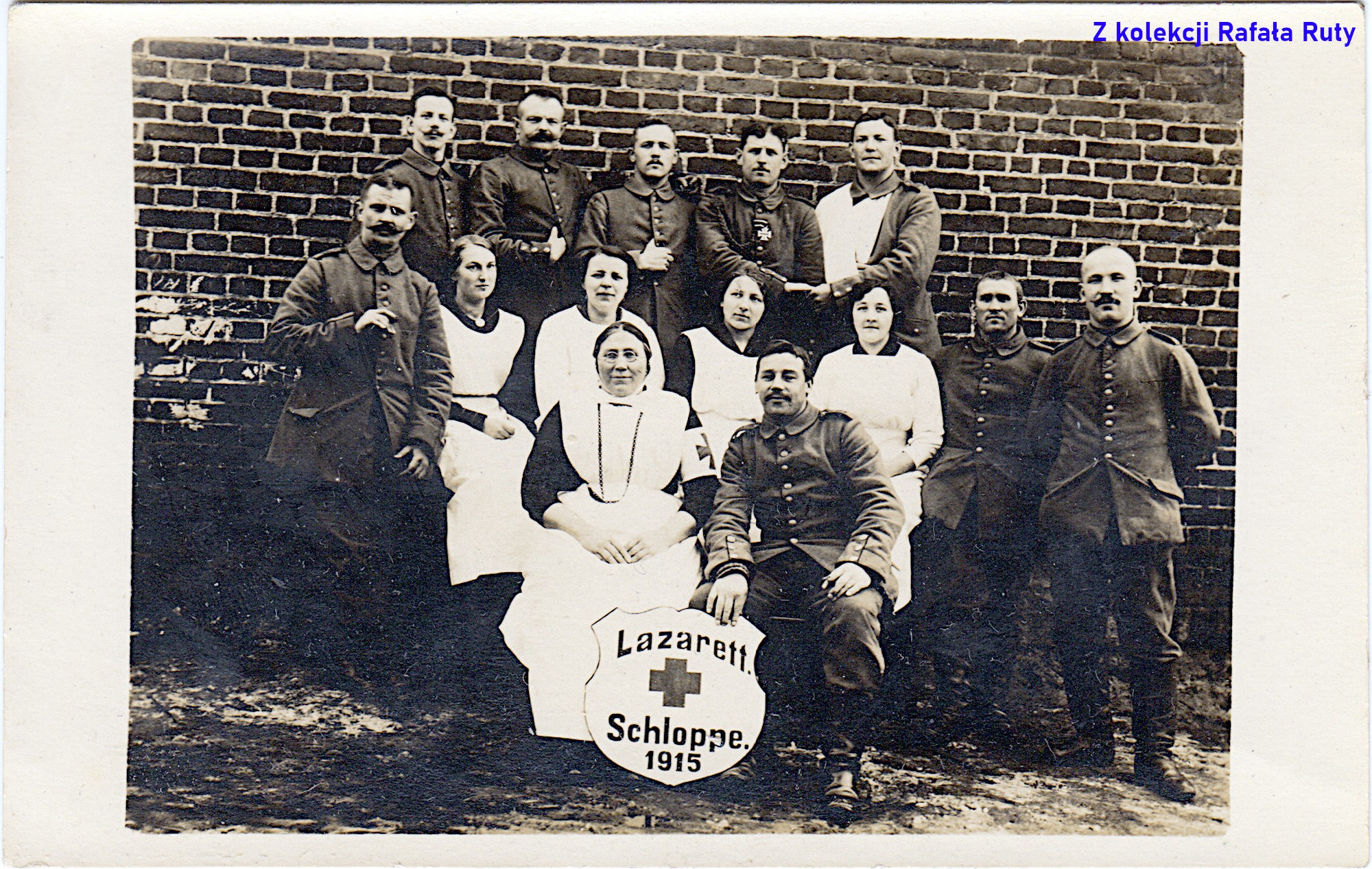 Podczas pierwszej wojny światowej człopski szpital mógł dodatkowo pełnić funkcję lazaretu dla lżej rannych żołnierzy niemieckich lub rekonwalescentów. I wtedy mogły powstać zdjęcia, które powielono w formie pocztówki. Zdjęcia, ponieważ znana jest współcześnie koloryzowana fotografia w tej samej scenerii, ale z dodatkowymi osobami – kliknij, aby zobaczyć (dostęp 8 kwietnia 2025 roku). Tu widzimy dziewięciu mężczyzn w mundurach (wśród nich odznaczony krzyżem żelaznym, a jeden z ręką na temblaku) – mogą to być pacjenci albo personel pomocniczy lazaretu (i jednocześnie rekonwalescenci?). Wraz z nimi pozuje pięć kobiet w strojach pielęgniarek – ta w okularach to na pewno ich przełożona. Widoczna przed nimi stylizowana tarcza z napisem „Lazarett Schloppe 1915” mogła być oficjalnym szyldem placówki z naniesioną datą roczną jej uruchomienia lub stworzona wyłącznie na potrzeby podobnych sesji fotograficznych. Można jedynie przypuszczać, że zdjęcie wykonano przy budynku szpitalnym (ostał się częściowo do dziś – jego obecny adres to Podgórna 12) – pasuje wątek cegły i podmurówka z ciosanych kamieni.