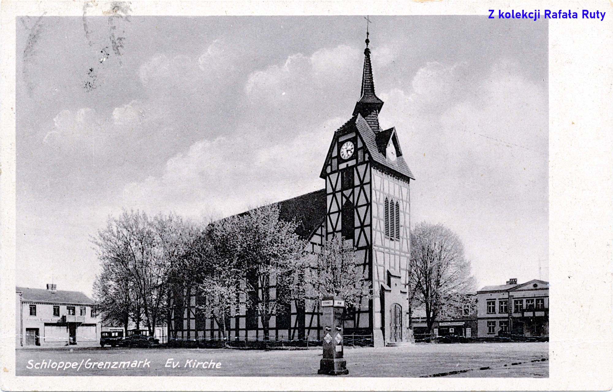 Pocztówka opisana „Schloppe/Grenzmark Ev[angelische] Kirche” („Człopa/Marchia Graniczna Kościół ewangelicki”) – użycie nazwy Marchii Granicznej znów sugeruje zaprojektowanie jej najpóźniej w 1938 roku. Z kolei widoczny na pierwszym planie dystrybutor paliwowy nosi oznaczenia firm Benzol-Verband GmbH (BV) – produkcja paliw i Hugo Stinnes Stettin – dystrybucja paliw oraz nazwę Aral – marka paliwa produkcji BV GmbH. Paliwo Aral pojawiło się na rynku w 1924 roku, więc ta data określałaby dolną granicę zrobienia tego zdjęcia. Warto wspomnieć, że nie był to jedyny dystrybutor w tym miejscu. Znacznie częściej utrwalano na fotografiach pompy znajdujące się bliżej południowej pierzei rynku – po prawej stronie tego kadru. W przypadku takich urządzeń zbiorniki paliwa były zakopywane w ich bezpośredniej bliskości. Zainteresowani tym tematem mogą zerknąć na ulotkę o przedwojennej stacji paliw w Strzelcach Krajeńskich – kliknij, aby zobaczyć (dostęp 8 kwietnia 2025 roku).