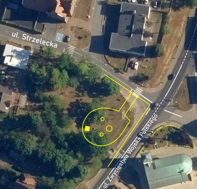 Z kolei w okręgu znalazły się: ratusz (Rathaus; po 1920 roku przeniesiony do kompleksu budynków przy obecnym Placu Zwycięstwa) i sąd obwodowy (Amts-Gericht; w tej lokalizacji od 1879 roku, w 1902 roku przeniesiony do nowego gmachu przy ulicy Strzeleckiej – obecnej siedziby Urzędu Miasta i Gminy). Z odręcznego dopisku powyżej budynku sądu odczytuję jedynie „mit Gefängniss…”, czyli „z więzieniem…” lub „z więziennym…”.