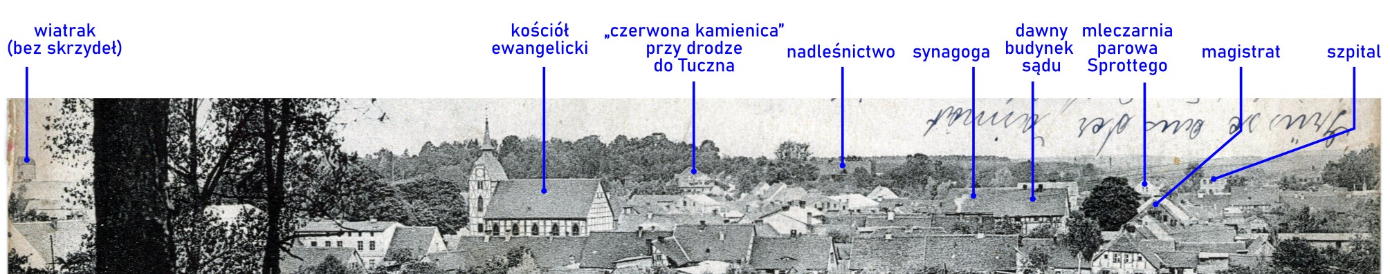 Na panoramie miasta oznaczono: szkołę ewangelicką (ev. Schulhaus; tak zwana „czerwona kamienica”, obecnie przy ulicy Adama Mickiewicza 19), drewniany kościół katolicki pod wezwaniem świętego Wojciecha (kath. Kirche; z 1660 roku, spłonął w 1945 roku), kościół ewangelicki (ev. Kirche; tu jeszcze bez wieży, którą dostawiono po remoncie po uderzeniu pioruna w 1901 roku, rozebrany w latach 1960; czyjaś ręka dopisała nad nim ołówkiem, jeśli dobrze odczytuję, „ohne Thurm”, czyli „bez wieży”).