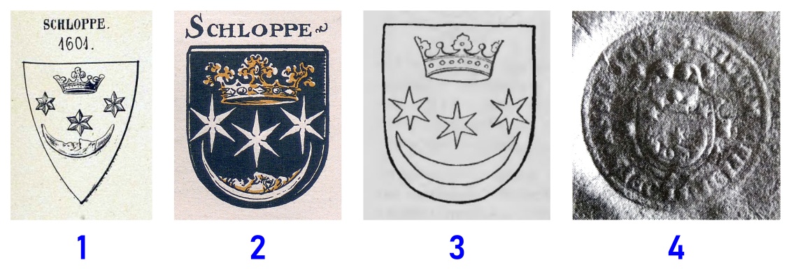 Chronologia: (1601) 1747-1806; Oryginał: Archiwum Państwowe w Poznaniu, [zespół] Poznań cechy, sygnatura 379, karta 5; Archiwum Państwowe w Toruniu, [zespół] Katalog III, sygnatura 5928; Legenda: SIGILLVM OPPIDI SLOPPA ANNO 160[1] | [F(RIDERICVS)] [A(DVOATUS] S(LOPPENSIS); Opis: W polu pieczęci hiszpańska tarcza herbowa w kartuszu. W tarczy od głowicy ku podstawie: korona o trzech sterczynach, trzy sześciopromienne gwiazdy (2, 1) i w podstawie sierp księżyca z rysami ludzkiej twarzy, barkiem w dół. Nad górną krawędzią tarczy litery, z których jedynie ostatnia S pozostaje czytelna;