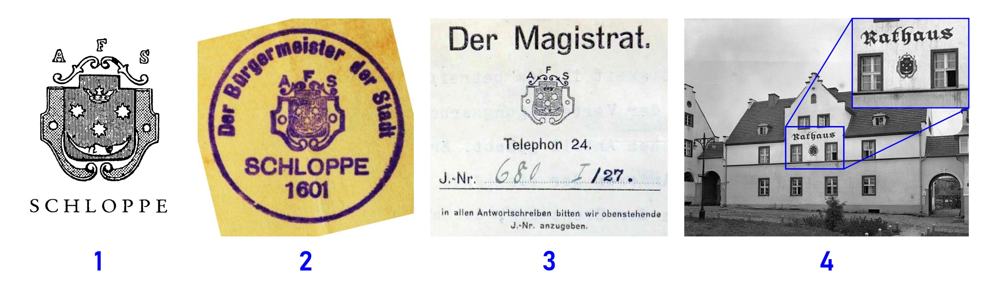 Der Ort erhielt erst 1601 Stadtrechte; das demnach älteste: „• SIGILLVM • OPPIDI • SLOPPA • ANNO • 1601“ (28 mm) zeigt, wie auch alle späteren Siegel, über dem Schilde die Initialen A•F•S• (Bedeutung?)