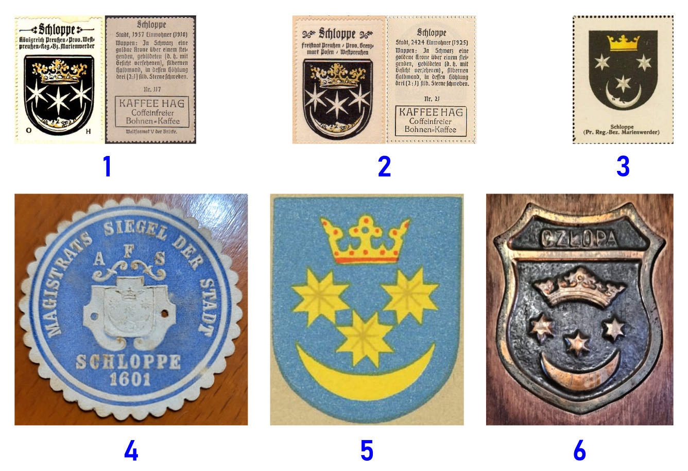 miasto w powiecie wałeckim, założone dopiero w 1601 roku, posiada z tegoż roku pochodzący herb i pieczęć, która wyobraża ozdobną tarczę, a w niej półksiężyc z trzema gwiazdami, nad którymi korona. Ponad tarczą znajdujemy litery FAS, a w otoku napis: SIGILLVM • OPPIDI • SLOPPA • ANNO • 1601 (30 milimetrów). Pieczęć taką znaleźliśmy wyciśniętą na szeregu dokumentów z lat 1747 do 1806 roku, co razem z datą w otoku świadczy, że była przeszło 200 lat w użytku. Niezrozumiałe są tylko litery AFS albo raczej FAS, które mogą się tłumaczyć jako Fridericus (?) Advocatus Sloppensis. Litery te powtarzają się zresztą i na późniejszej pieczęci z XIX wieku, mimo że już dawno straciły swoje znaczenie. Barwy tego herbu nie są znane i Siebmacher nie daje ich zupełnie. Hupp proponuje złotą koronę, białe gwiazdy i biały księżyc na czarnym tle. Szło mu widocznie o zaznaczenie kolorów pruskich. Tymczasem miasto powstało w polskich czasach i dlatego właściwsze będą kolory: złota korona, biały księżyc i gwiazdy na tle czerwonym.